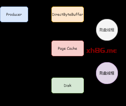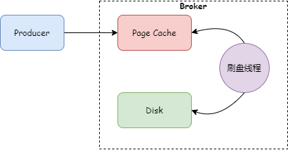 RockerMQ 默认采用异步刷盘策略,Producer 把消息发送到 Broker 后,Broker 会先把消息写入 Page Cache,刷盘线程定时地把数据从 Page Cache 刷到磁盘上,如下图:
