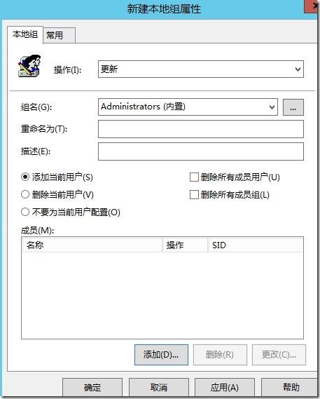 操作中的“更新”代表更新域客户端 Administrators 组中的成员,而不是新建组;“添加当前用户”表示添加登录时的域帐号到客户端系统的本地 Administrators 组,只要域帐号一登录,就把它加入本地管理员组,也可以同时选中右边的“删除所有成员用户”或者是删除所有成员组,意思是将当前登录的用户加入到本地管理员组的时候,删除其他成员用户或者是组,以起到动态加入管理员组的效果,也就是始终保持最近登录的用户是在管理员组中