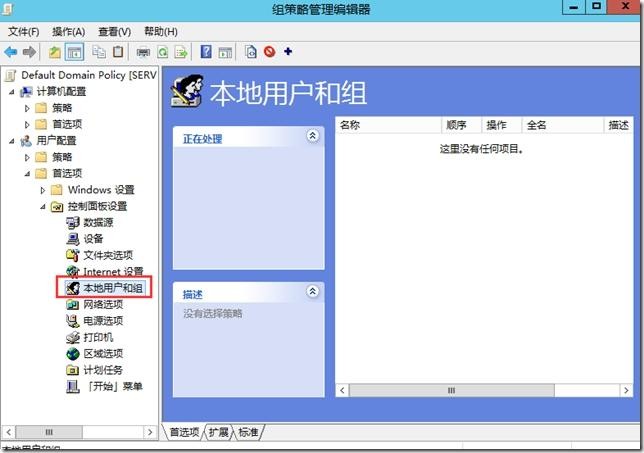 登录到域控制器,打开基于域的策略—–用户配置—首选项—控制面板设置—本地用户和组,以下图所示: