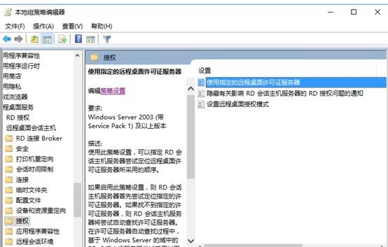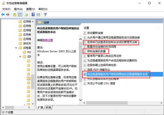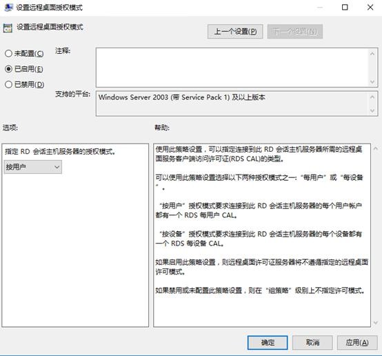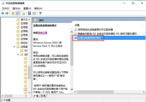 运行—>gpedit.msc->计算机配置—管理模板—windows 组件—远程桌面服务—远程桌面会话主机—-授权, 找到 “设置远程桌面授权模式”,设置为启用,并在”指定 RD 会话主机服务器授权模式”中,选择”按用户”。