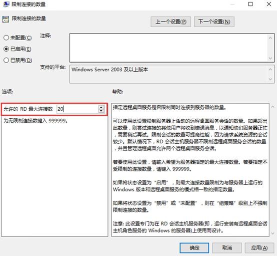 限制连接的数量—选择启用,配置’允许的 RD 最大连接数’为 20 个(这个数字不是固定的, 按需求来)