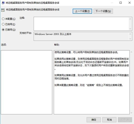 将远程桌面服务用户限制到单独的远程桌面服务会话—选择禁用