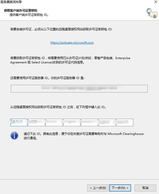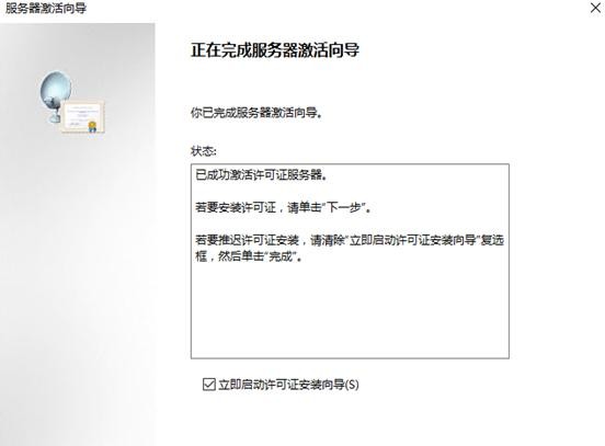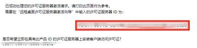 可以得到”已成功处理您的许可证服务器启动申请。你的许可证 ID 是:,又是一个需要抄下的分为七段的 35 位数,里面包含有数字也有大写的英文字母;并且还会问你”需要此时获取客户机许可证吗?”选择”是”
