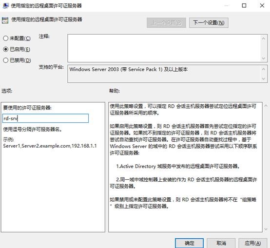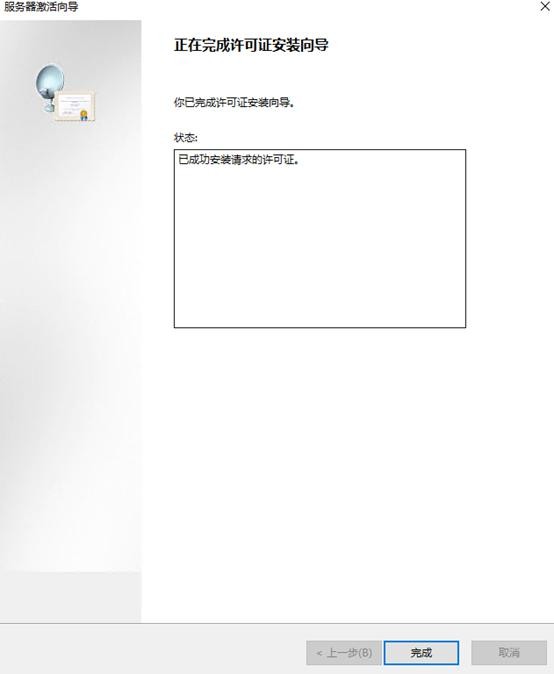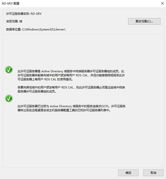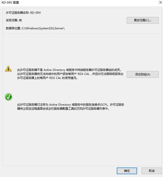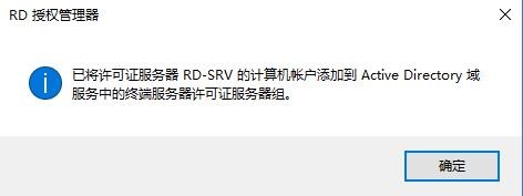 点击继续后,会显示已将许可证服务器 RD-SRV 的计算机账户添加到 Active Director 域服务中的中断服务器许可服务器组,然后点击确定。
