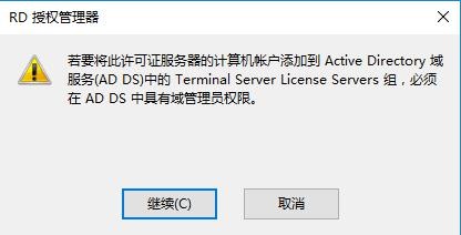 在弹出的警告中显示若将此许可服务器的计算机账户添加到 Active Director 域服务(AD DS)中的 Terminal Server License Servers 组,必须在 AD DS 中具有管理员权限,然后点击继续。