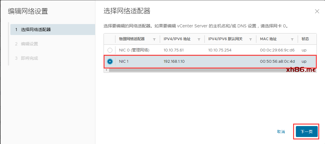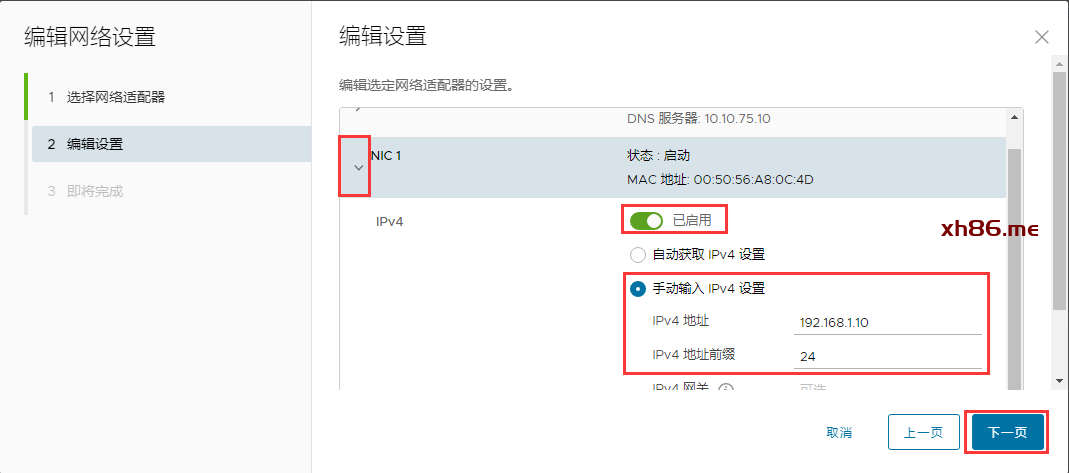 点击NIC1下拉箭头展开菜单,然后IPv4 已经用点开,绿色状态,然后点击手动输入IPv4设置,这边笔者输入的是192.168.1.10,子网掩码24,网关一栏留空,然后点击下一页.