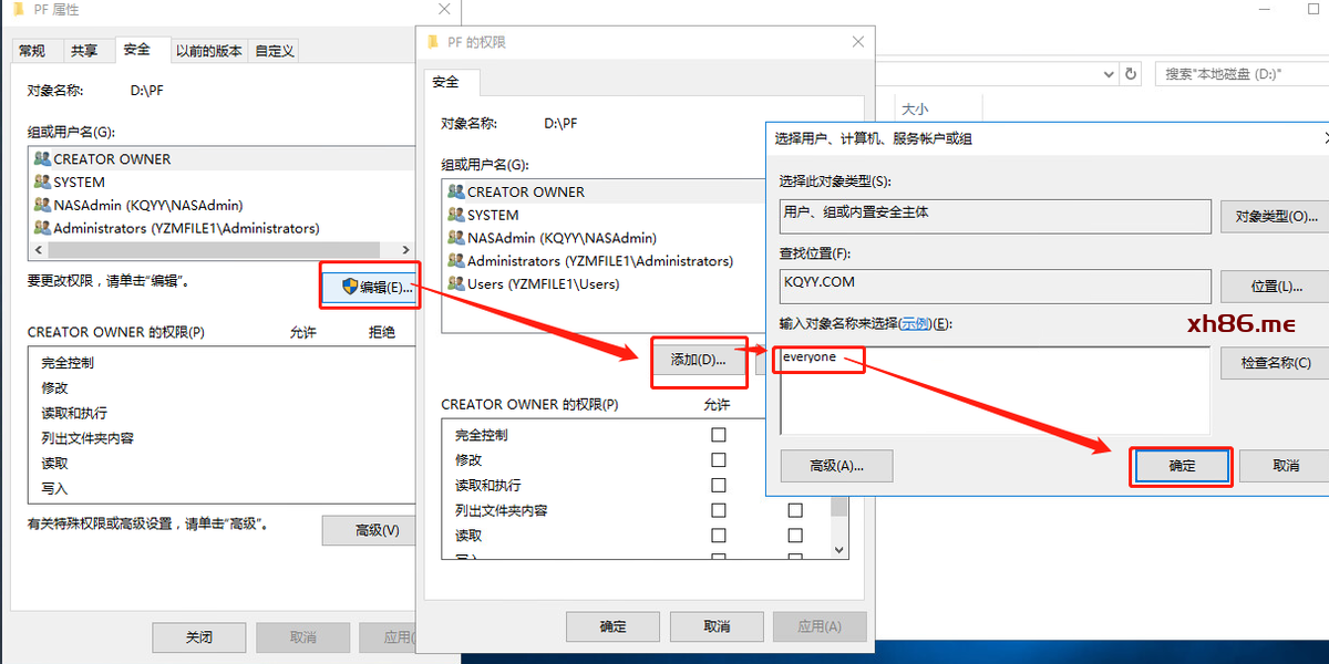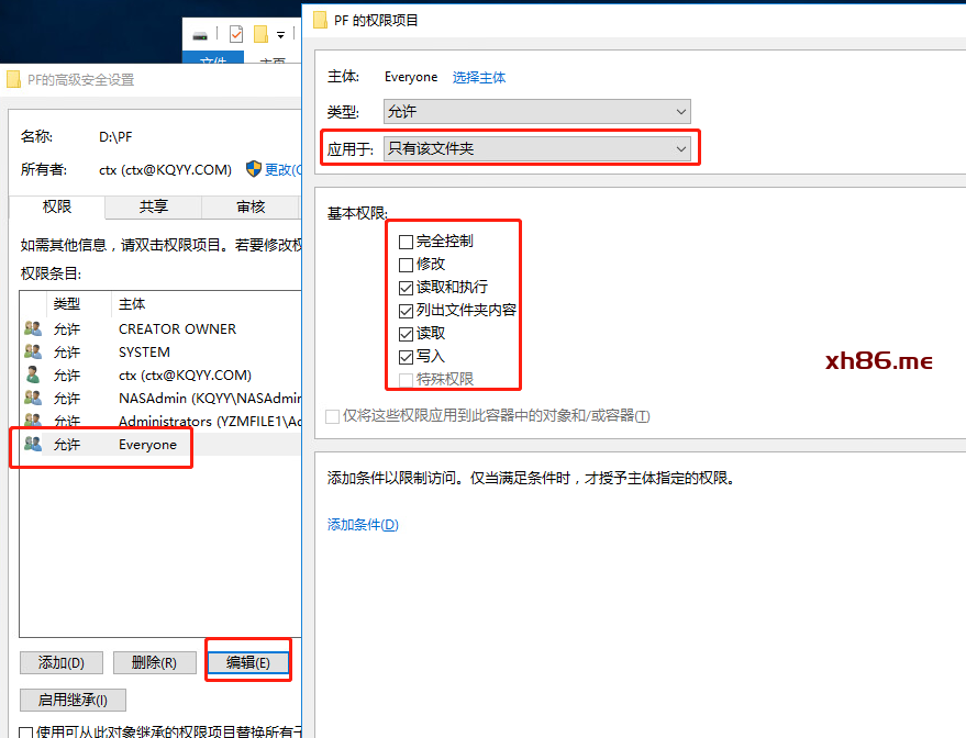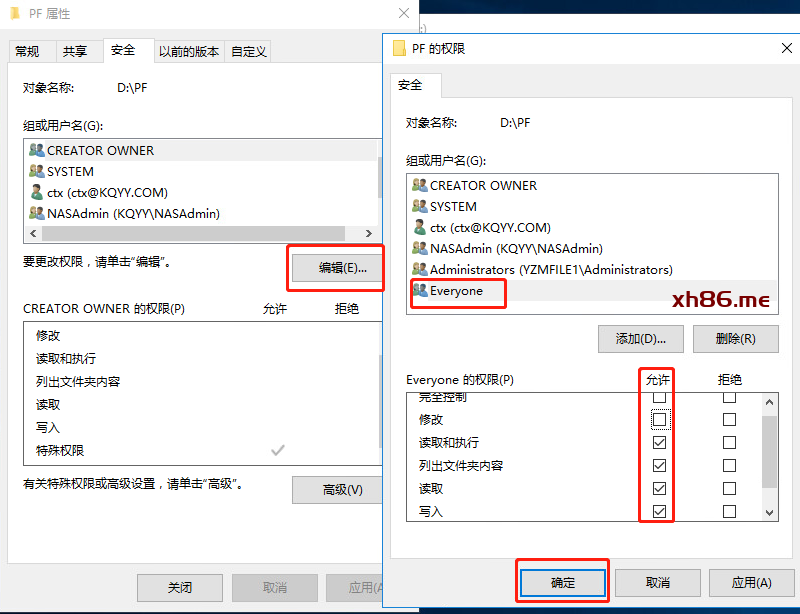 编辑Everyone,将应用于改为『只有该文件夹』,权限不变,确定,关闭即可