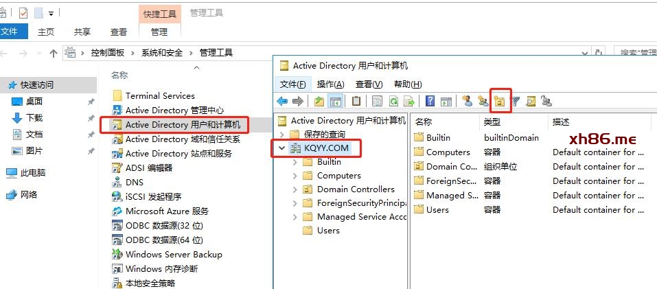 此时可以看到管理工具里多了几项域控的组件,打开“Active Directory用户和计算机”,选择主域,点击工具栏上的