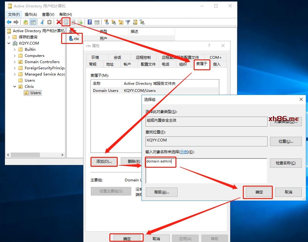 由于我们需要将此用户做于管理员帐号,因此需要将此帐号加入到域管理员组里,按如下图所示操作: