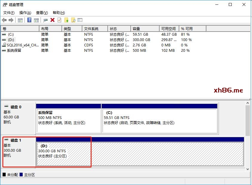 为此服务器挂一块300G的D盘,用户存储数据库: