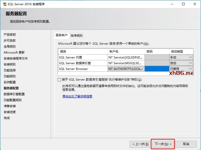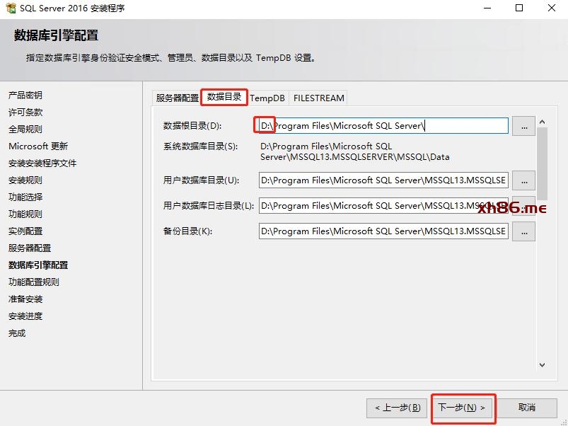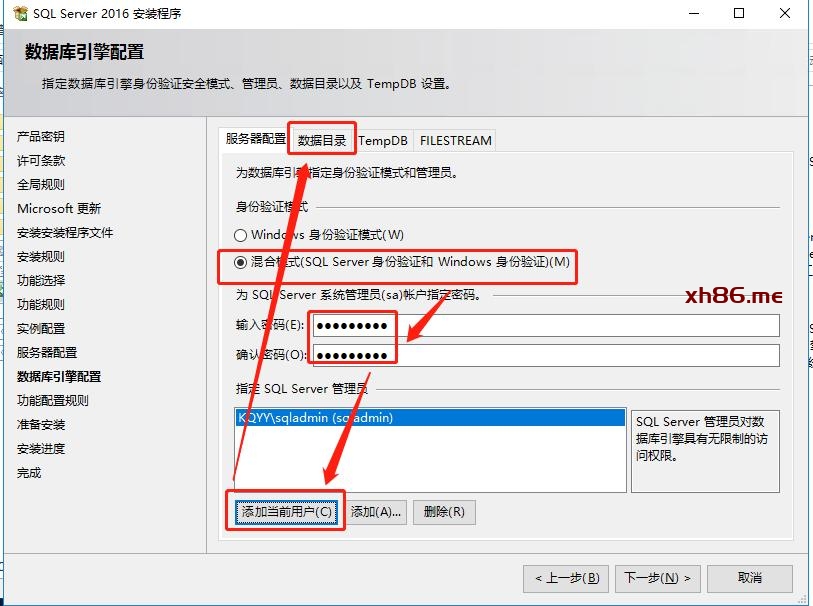 选择混合格式,输入两次相同的SA密码,点击添加当前用户,然后再点击数据目录