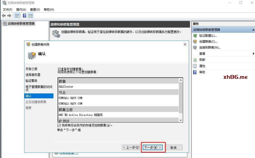 如上步骤将另外一台SQL2也做相应的配置网络、加域、安装SQL,即可按如下步骤开始配置故障转移集群: