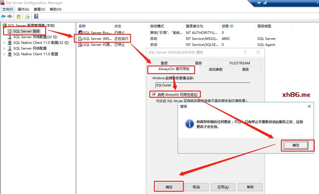 打开“SQL Server Configuration Manager”工具,定位到SQL Server服务,双击”SQL Server(MSSQLSERVER)“,选中”AlwaysON高可性“的标签卡,勾选上”启用AlwaysON可用性组“,确定,确定。