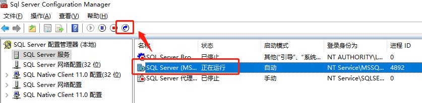 按下图操作重启” SQL Server(MSSQLSERVER)“服务。