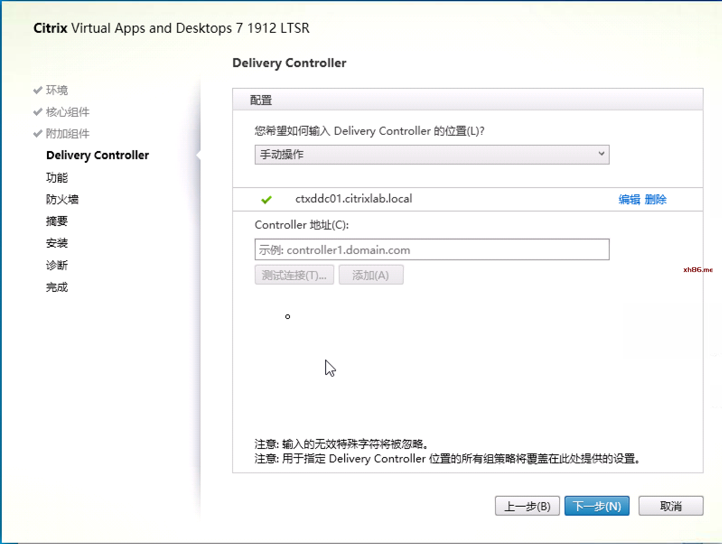 进入Delivery Controller,在 Controller地址中输入DDC的完整FQDN名称,点击测试连接,确保右边出现一个绿色的对号,点击添加。如果您有多个DDC,请重复这个操作。
