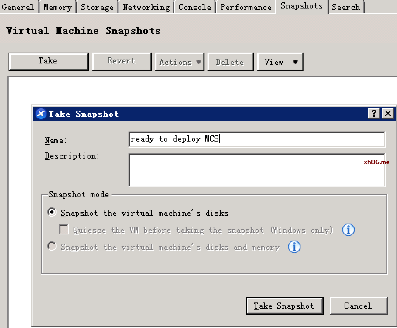 关闭虚拟机,确保虚拟机关闭后,创建快照。在XenCenter中找到MCSWin1064_Temp,点击Snapshots🡪Take Snapshot🡪输入名称。(请不要使用中文)