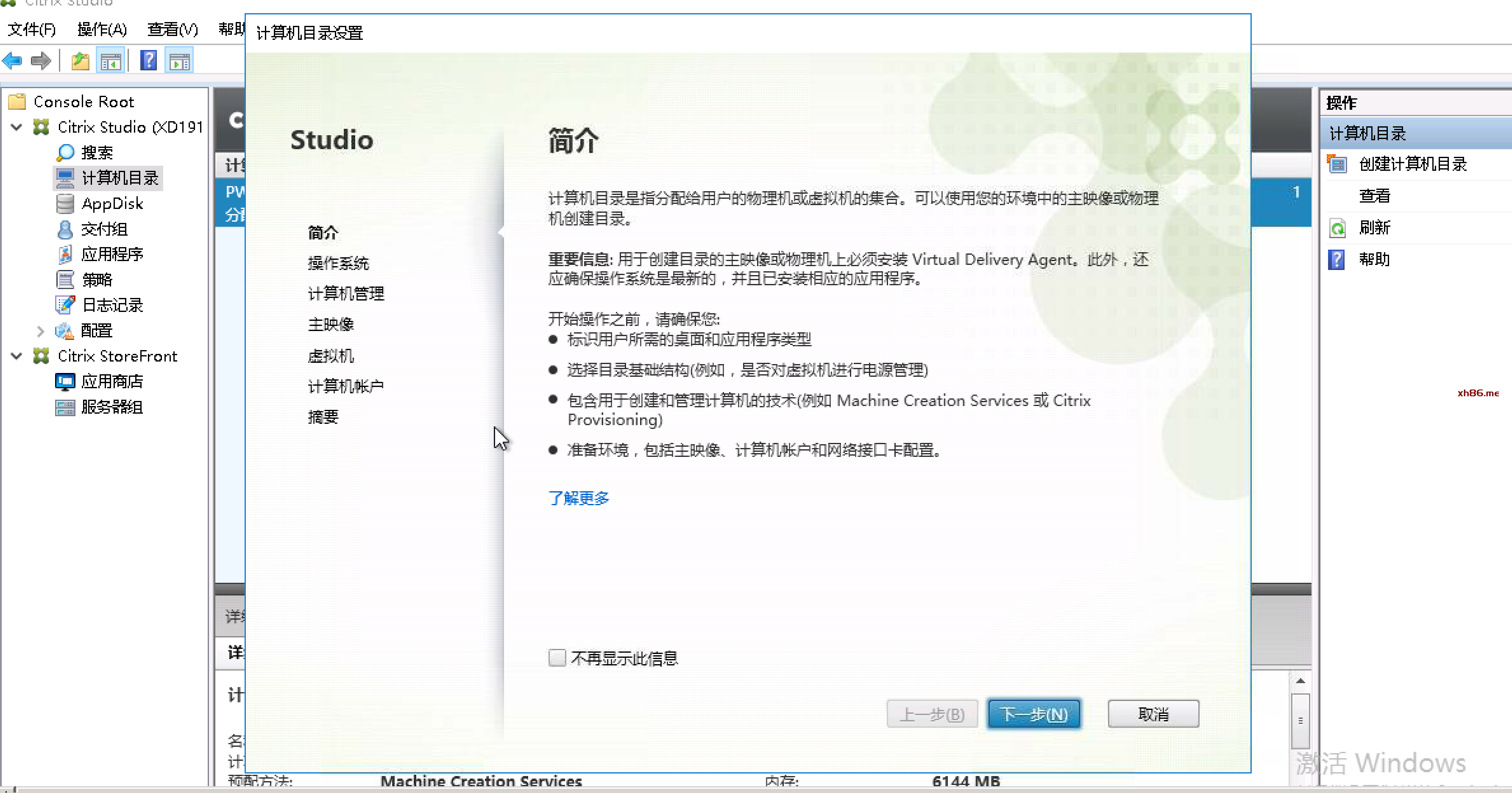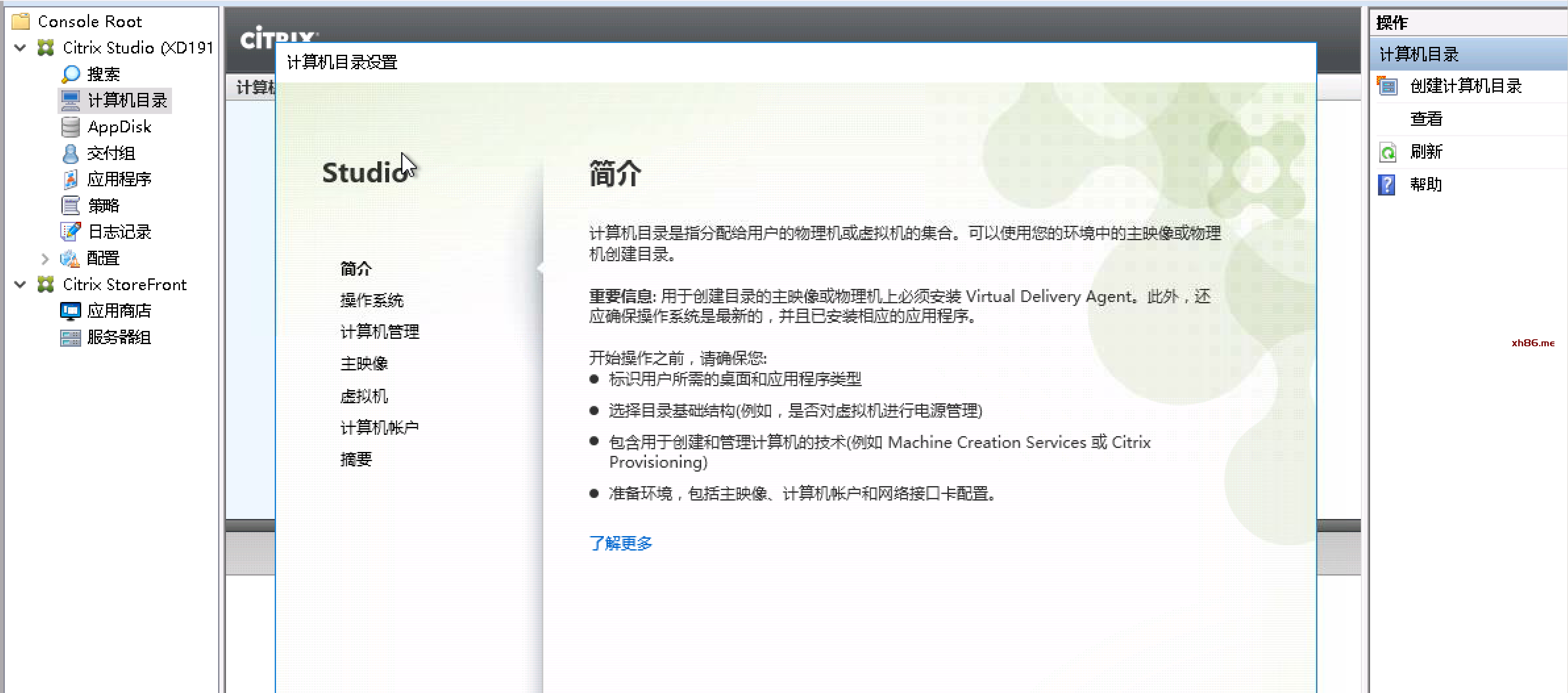 打开Citrix XenDesktop Studio控制🡪在左侧点击“计算机目录”,在最右侧“创建计算机目录”,系统即启动计算机目录创建引导。
