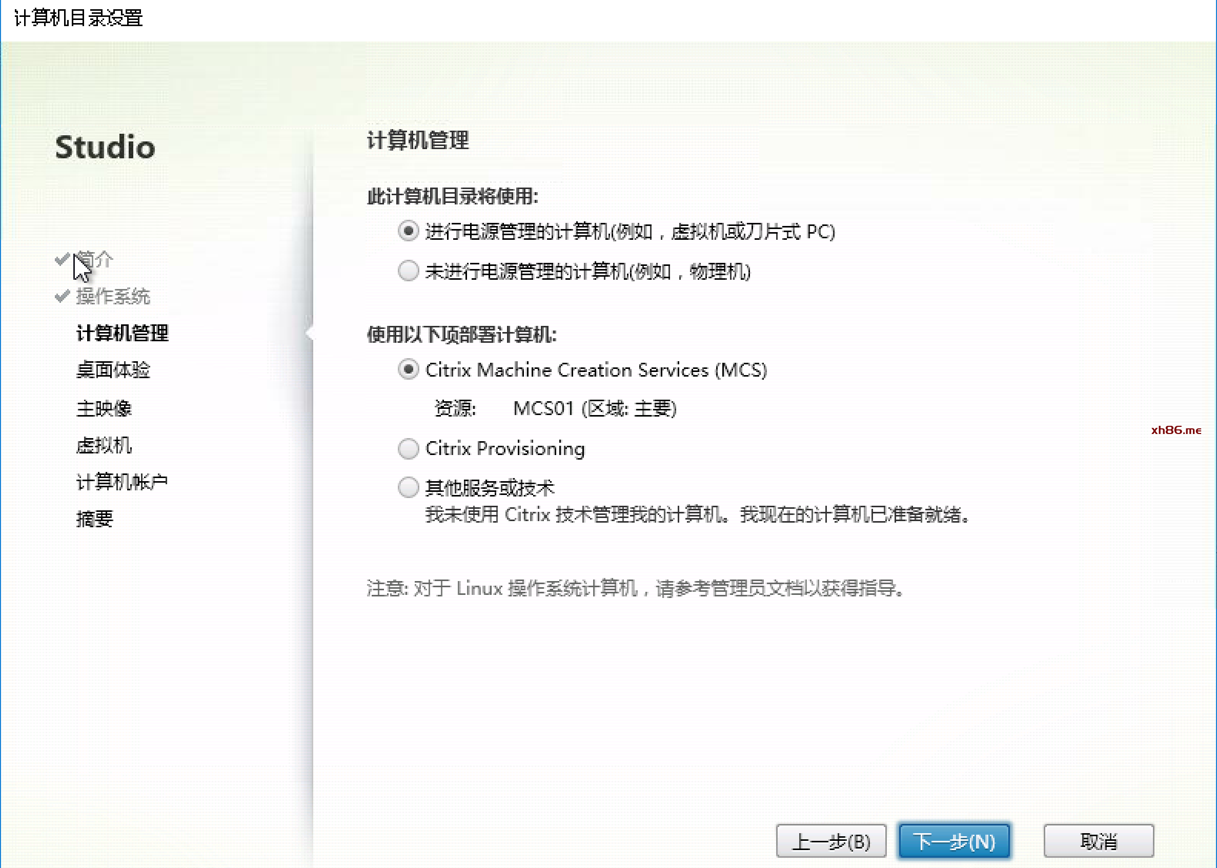 在“计算机管理”中,请选择MCS,并选择正确的资源。如果没有这些选择,请参考XenDesktop Studio安装的章节。