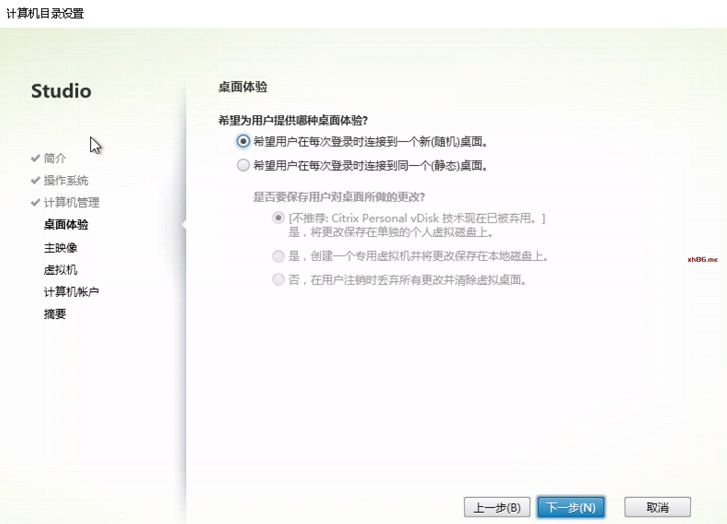 在计算机目录中选择“希望用户在每次登录时连接到一个新(随机)桌面”,如果你希望用户每次连接到固定的池化虚拟桌面,请选择“希望用户在每次登录时连接到同一个(静态)桌面”🡪“否,在用户注销时丢弃所有更改并清除虚拟桌面”。