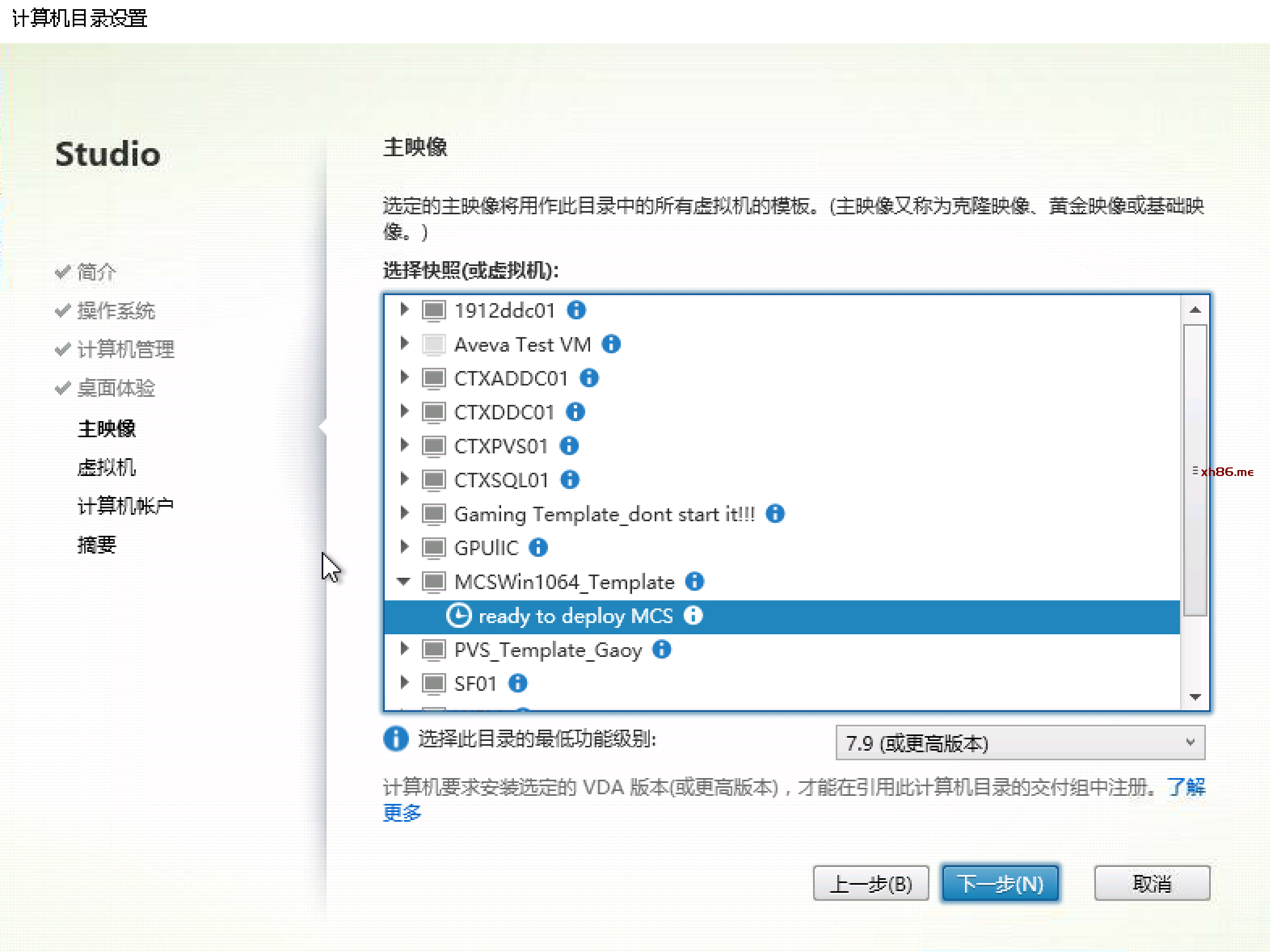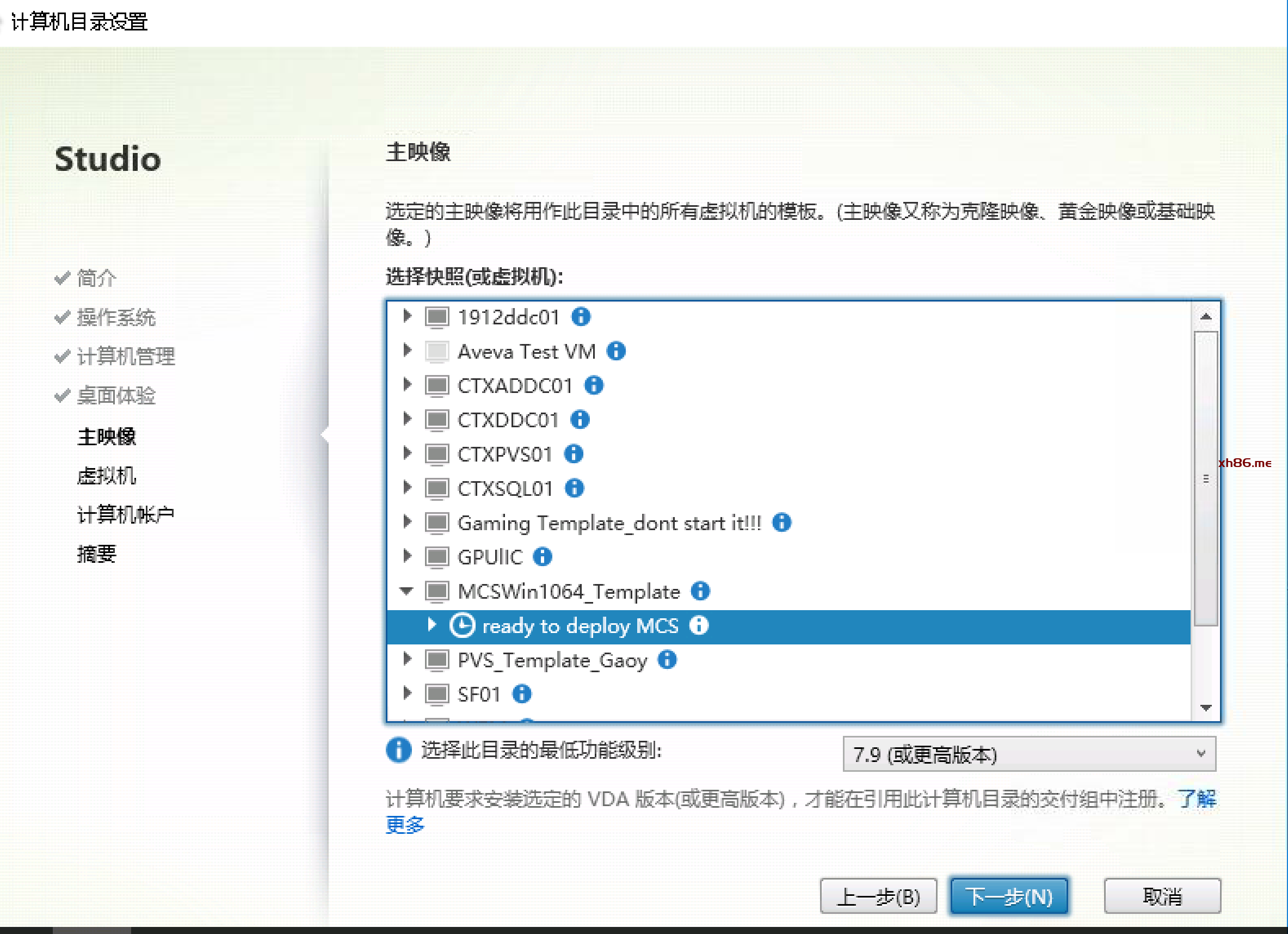 在“主映像”中,选择“MCSWin1064_Template”中的快照“ReayToDeploy MCS”,点击“下一步”按钮,继续下一步操作。