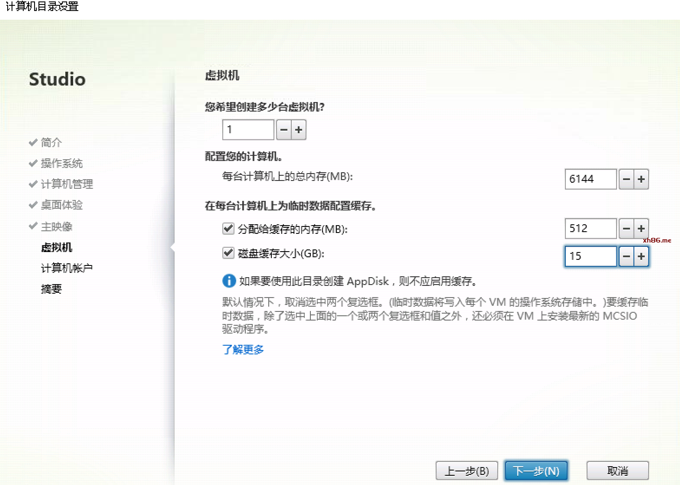 进入虚拟机配置中,请设置好:批量创建虚拟机的数量、配置虚拟机的内存大小、磁盘缓存大小,基于虚拟机性能角度,Citrix建议启用“分配给缓存的内存”,PoC中我们建议配置512M,这意味着每虚拟机实际可用内存为5.5G,另外0.5G是用于缓存。