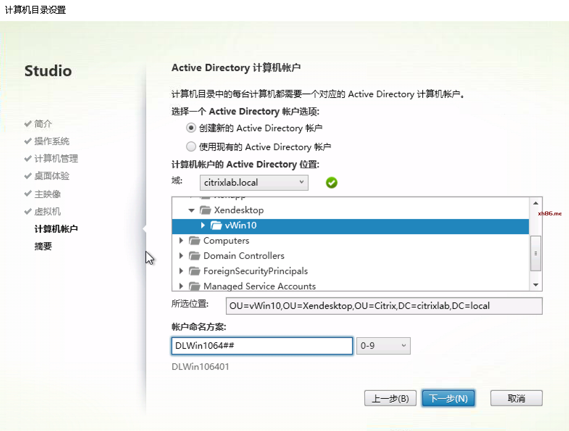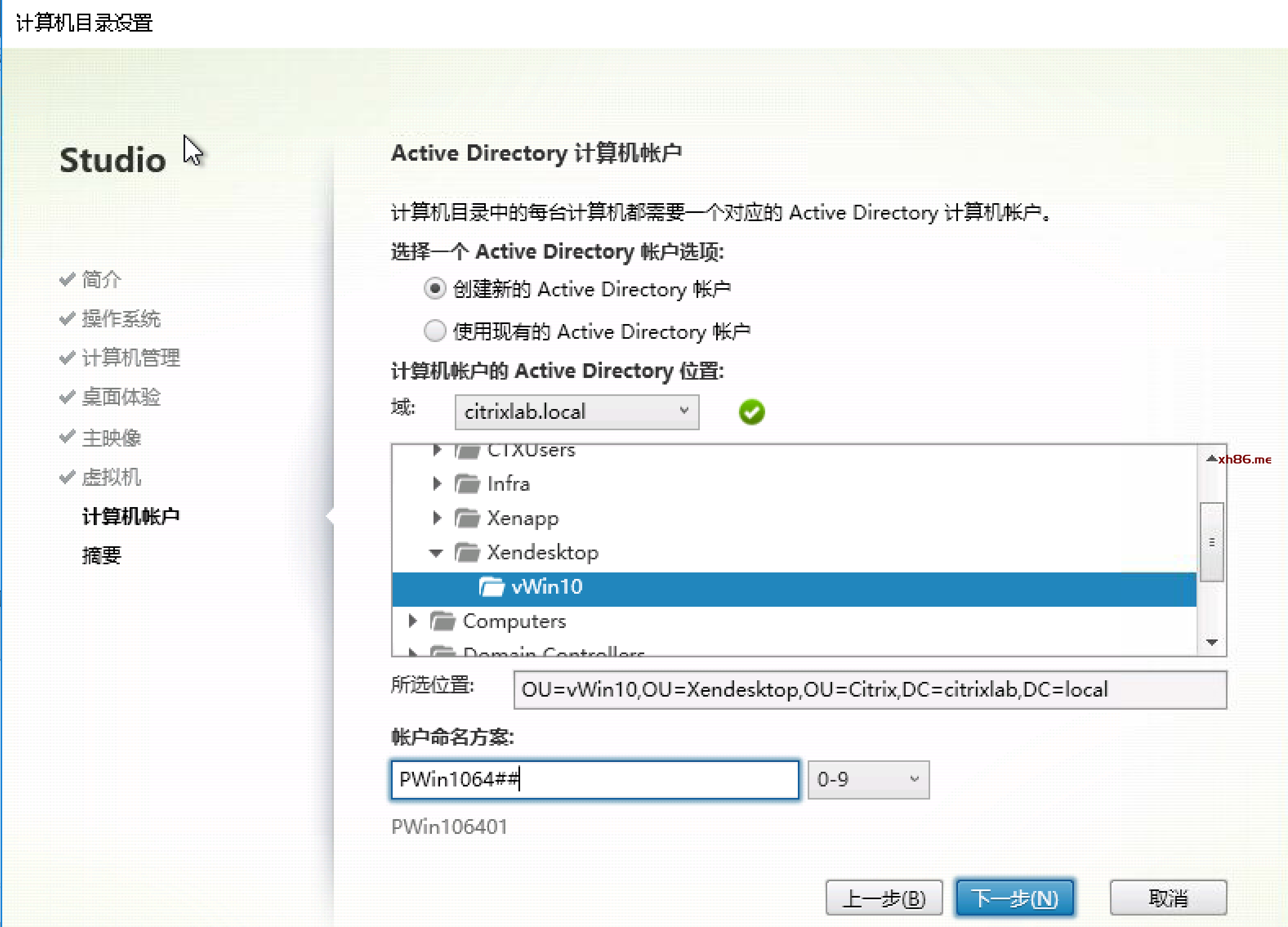 “计算机帐户”中,选择“创建新的Active Directory帐户”,并在域中选择相应的OU。关键点在于“帐户命名方案”,在此我们采用D代表Dedicated (专有桌面)L代表Linked Clone(链接克隆),Win1064代表操作系统,##代表计算机编号。