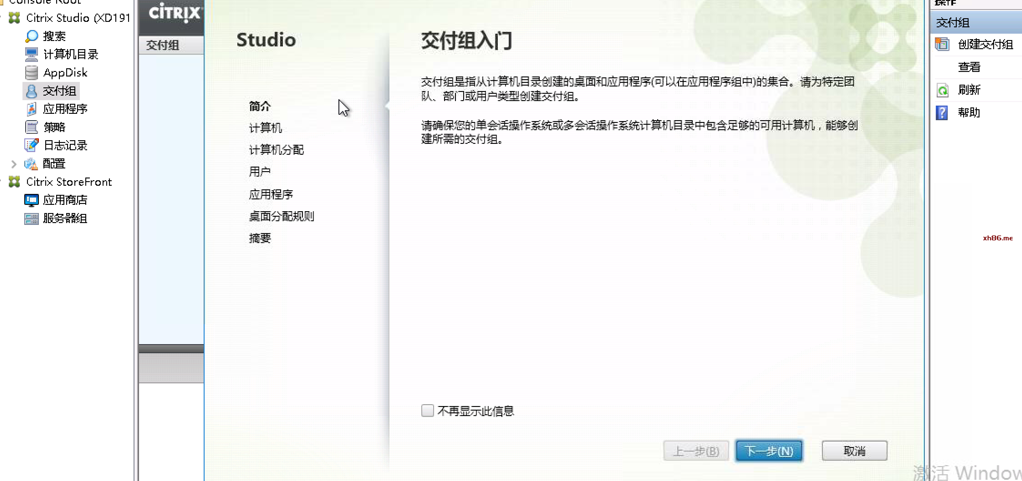 打开Citrix “Desktop Studio”控制台,在最左侧点击“交付组”,在交付组最右侧点击“创建交付组”,在出现的创建向导的对话框点击“下一步”继续。