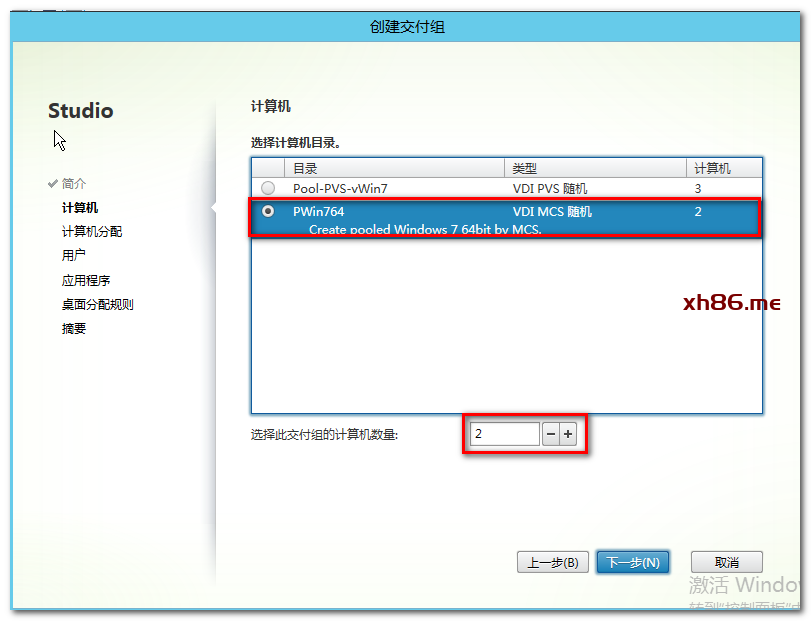 在计算机的环节,请选择之前我们已经创建好的计算机目录即“Pwin1064”,并在下方“选择此交付组的计算机数量”,点击下一步继续。