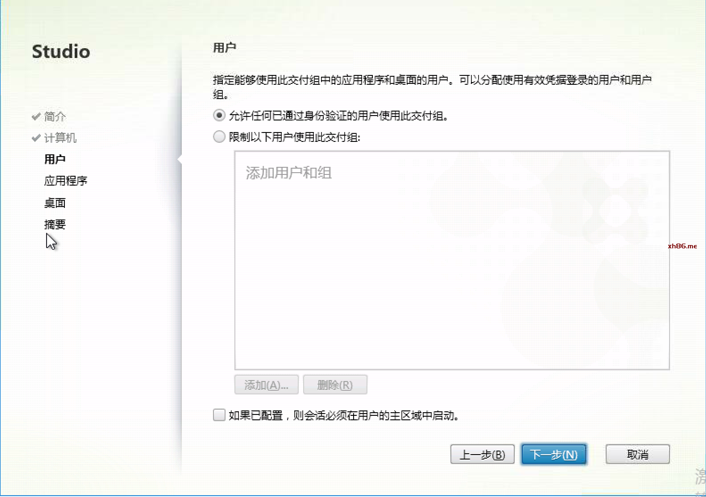 - 建议:我们建议将交付组中的虚拟桌面分配AD的组而不是用户,用户通过加入该AD组就可以获得虚拟桌面,可以节省日后的运维管理。例如:新的用户需要使用虚拟桌面,不需要到Citrix进行分配,而是直接加入该AD组就可以完成。