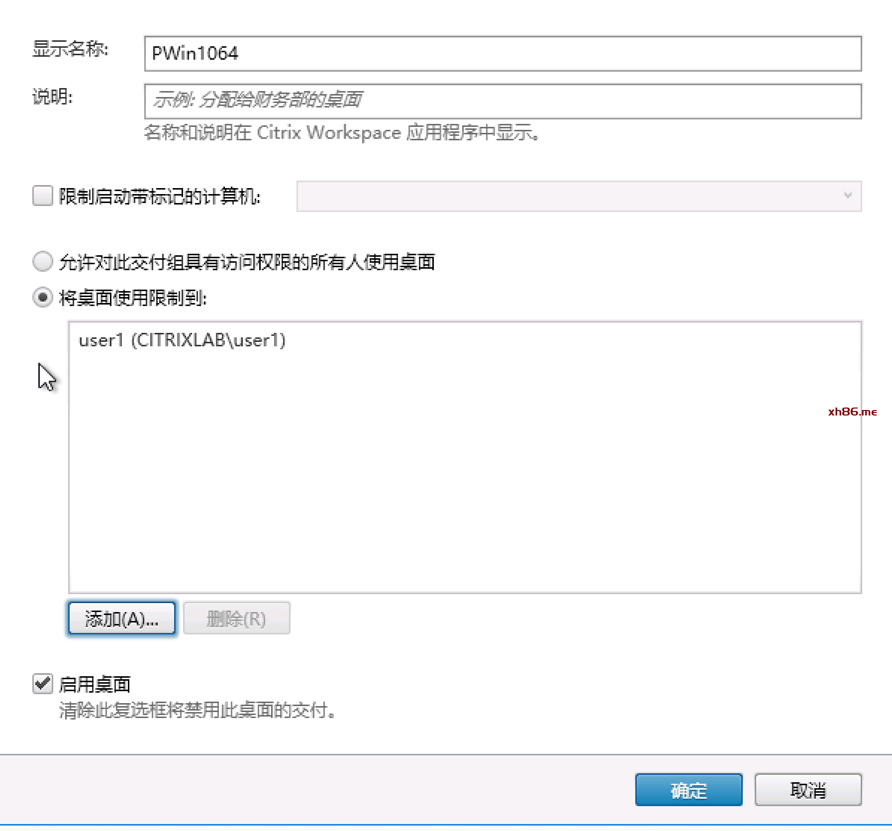 在添加桌面完成后,如果你需要添加多个用户或组,可以通过“添加”按钮进行重复上述的操作。请确认“启用桌面”已经勾选(默认系统是已经开启),点击“确定”。