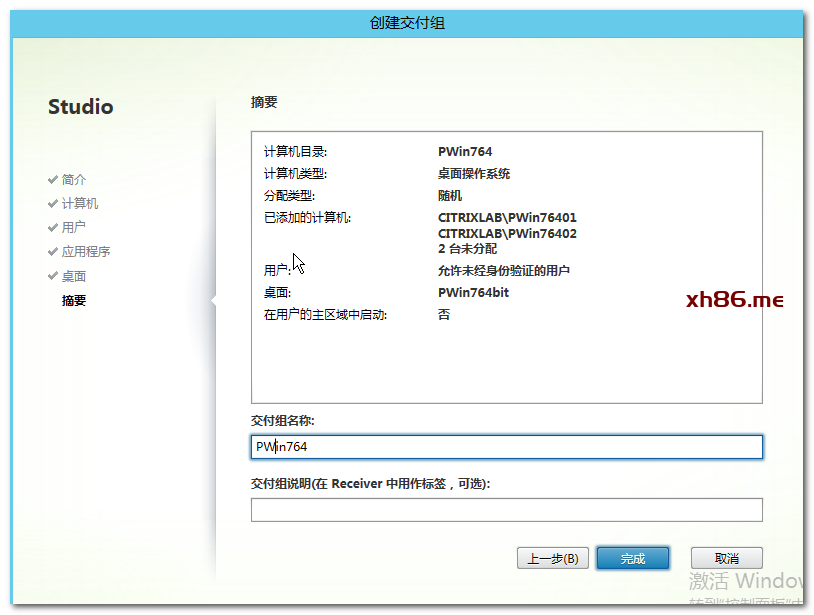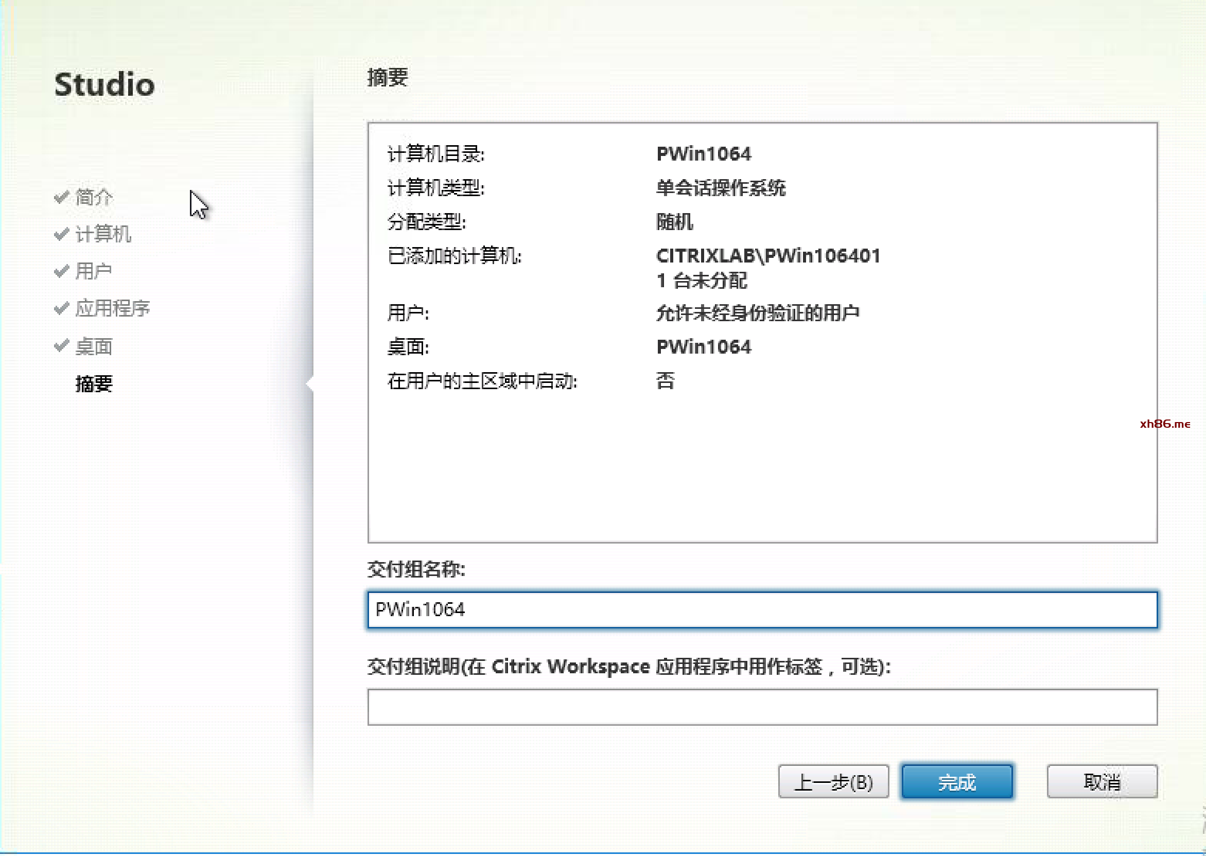 在“摘要”中,为交付组设置一个名称,建议使用中文字符。点击“确定”后,交付组创建完成。