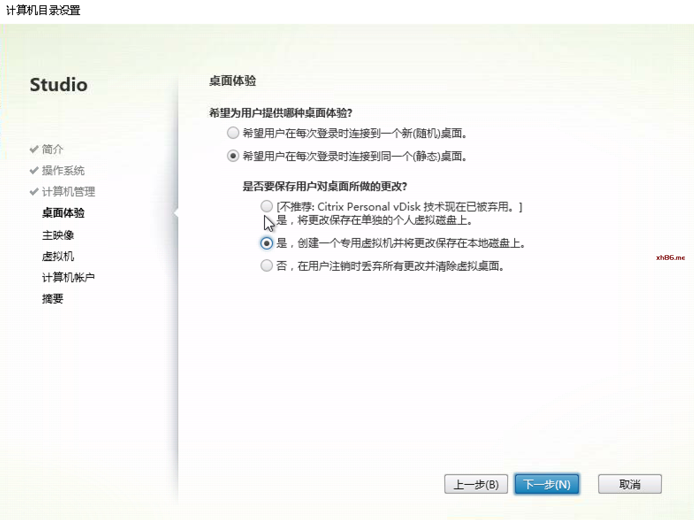 进入“桌面体验”,选择“希望用户在每次登录时连接到同一个(静态)桌面”,并在下方选择“是,创建一个专用虚拟机并将更改保存在本地磁盘上”,点击“下一步”。