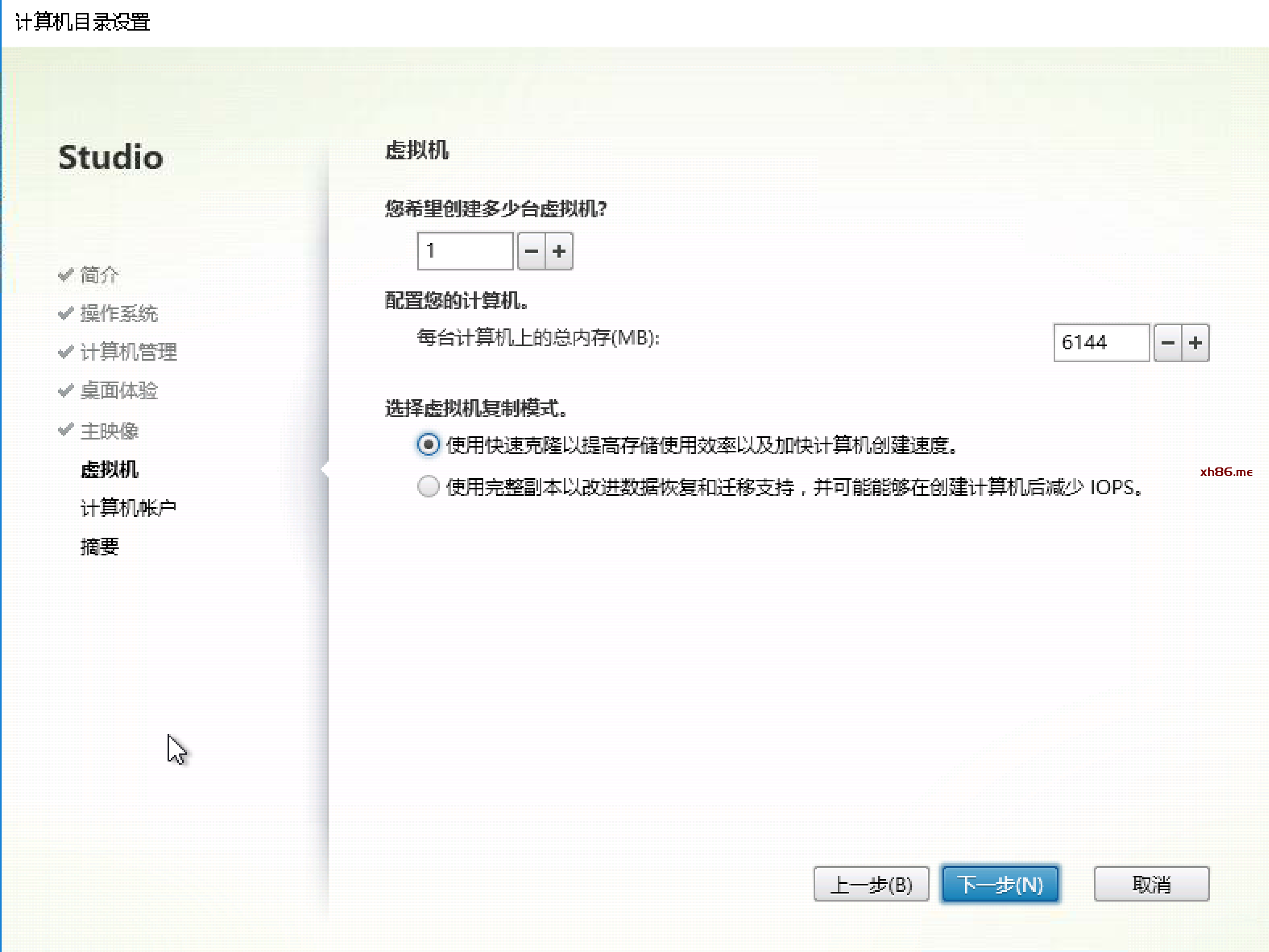 进入“虚拟机”设置,设置需要创建虚拟机的数量和内存大小,并选择“使用快速克隆以提高存储使用效率以及加快计算机创建速度”,或者选择“使用完整副本以改进数据恢复和迁移支持,并可能能够在创建计算机后减少IOPS”。点击“下一步”。