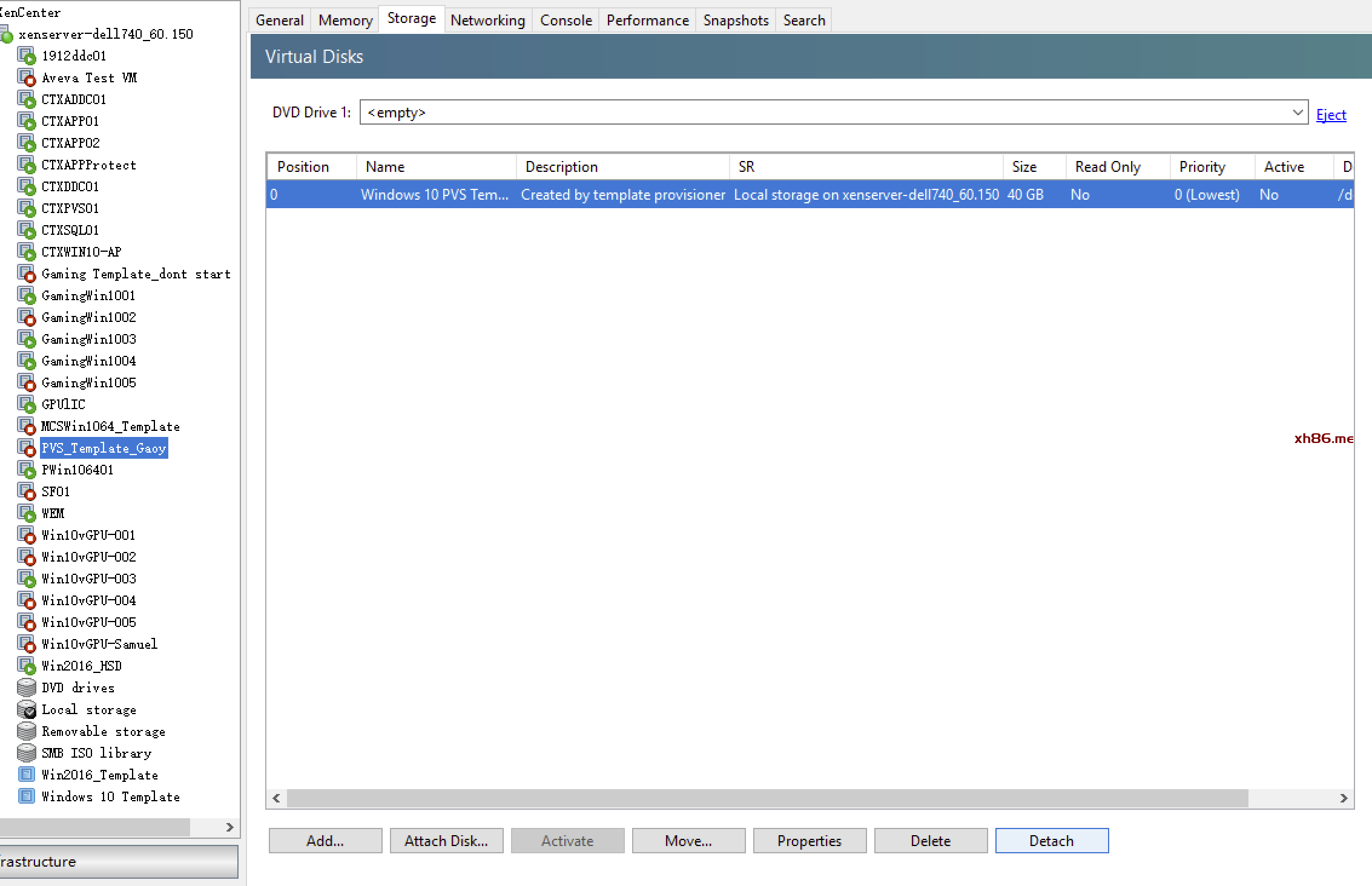 | 打开XenCenter,点击Win10虚拟机-Storage,点击磁盘-Properties