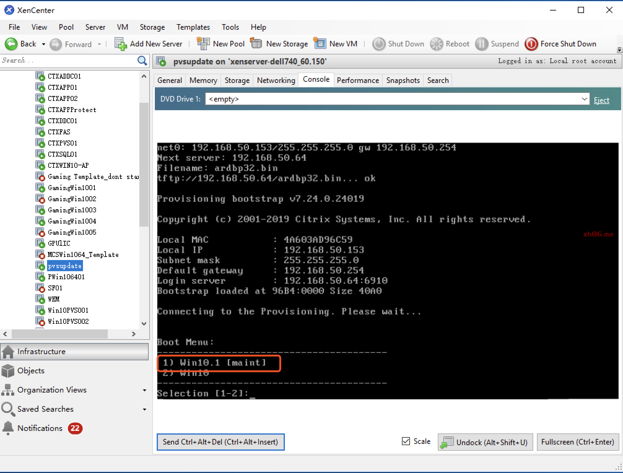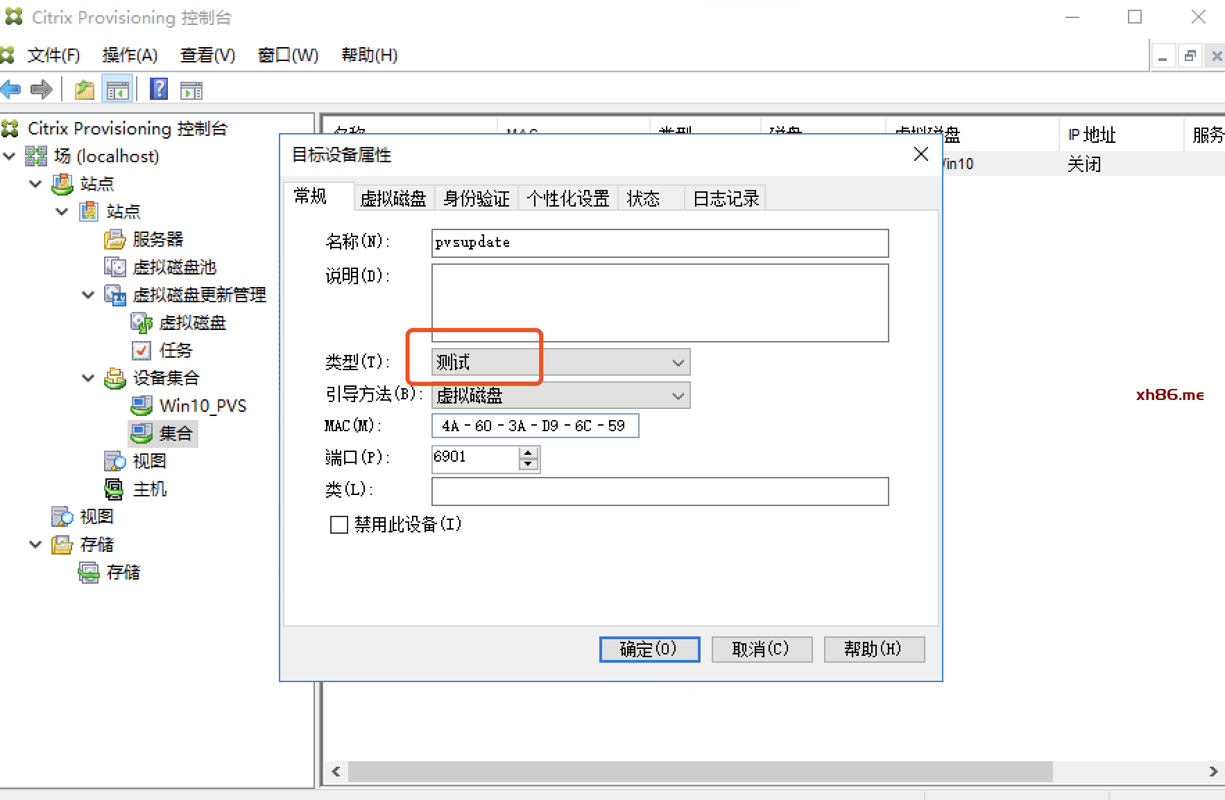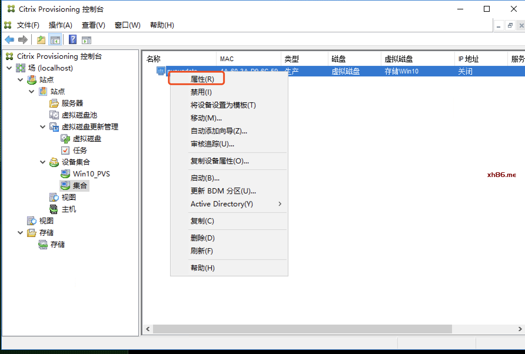 返回PVS控制台,在设备集合中特定的目标设备(通常是用于维护的虚机),右击“属性”