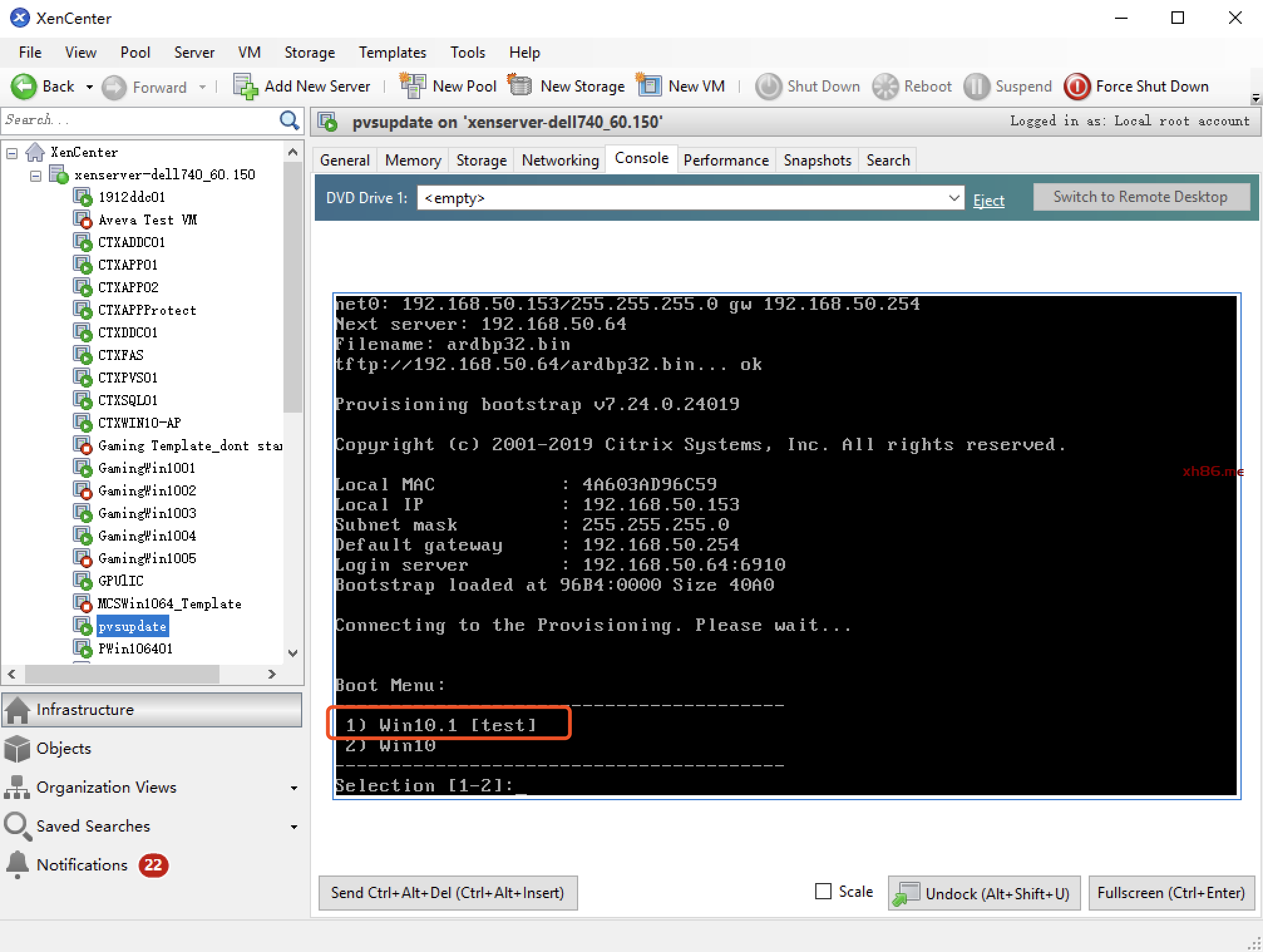 目标设备重启后,选择标识为test的版本,输入1,回车。