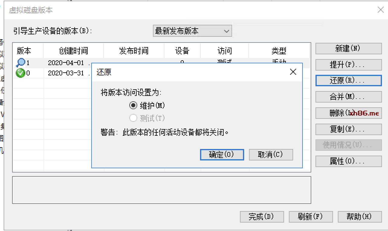 界面中将会增加一条新版本的记录,并设置为维护模式。系统会在存储上生成新的后缀名为.avhdx的虚拟磁盘。