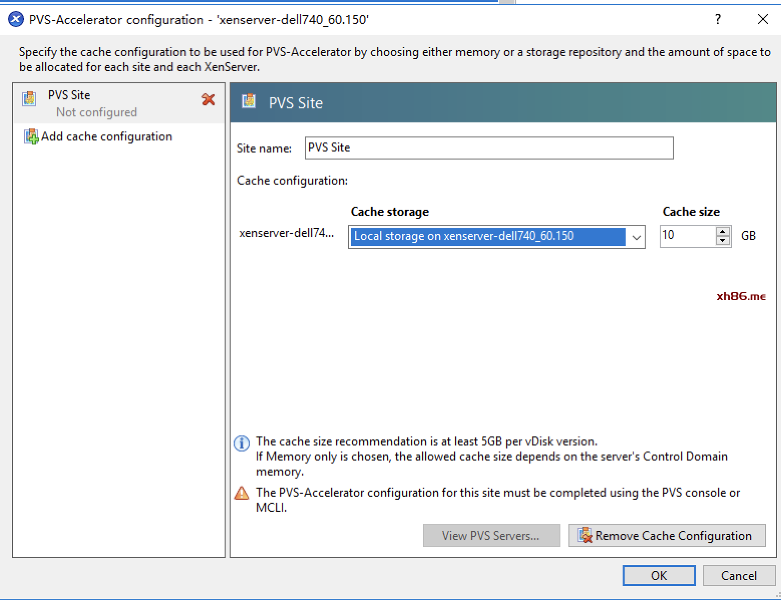 | 填写PVS Accelerator Site的名称,并逐一配置每台XenServer的Cache类型和大小。