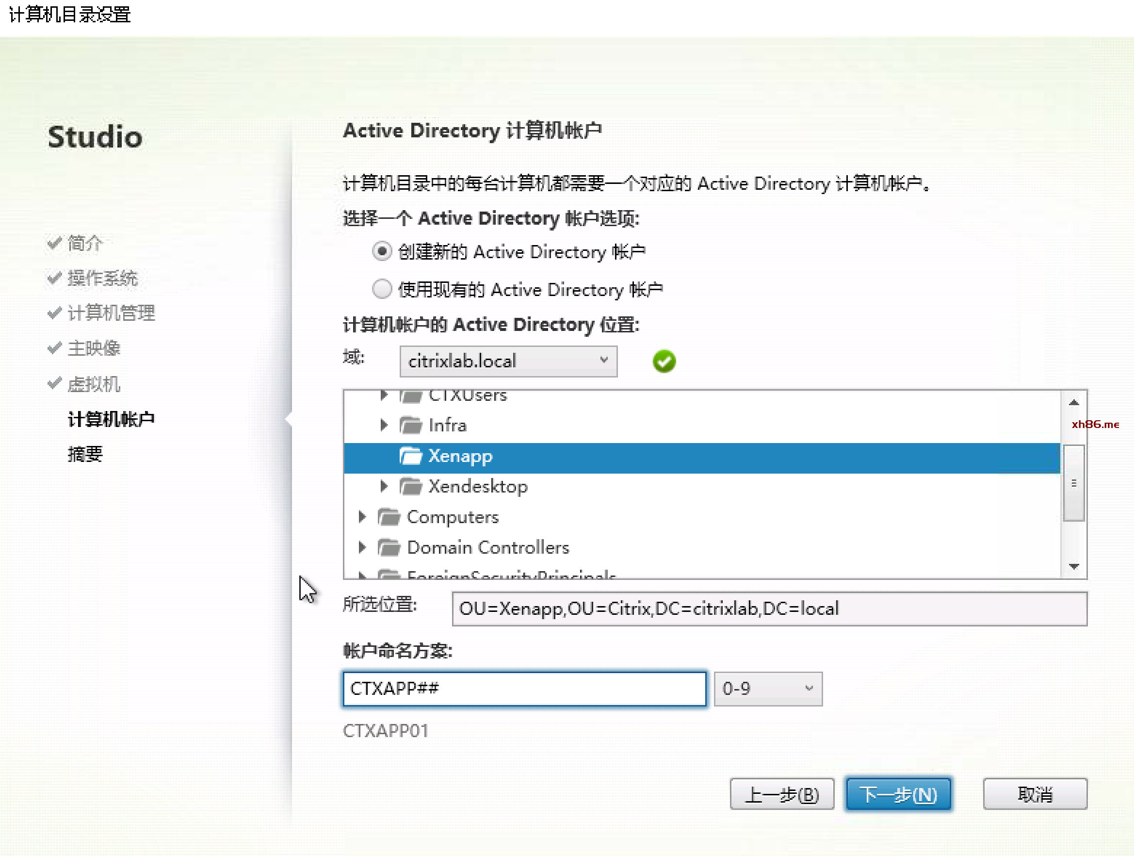 选择要创建虚拟应用计算机帐户的OU:Citrix,帐户命名方式为CTXAPP##,点击“下一步”