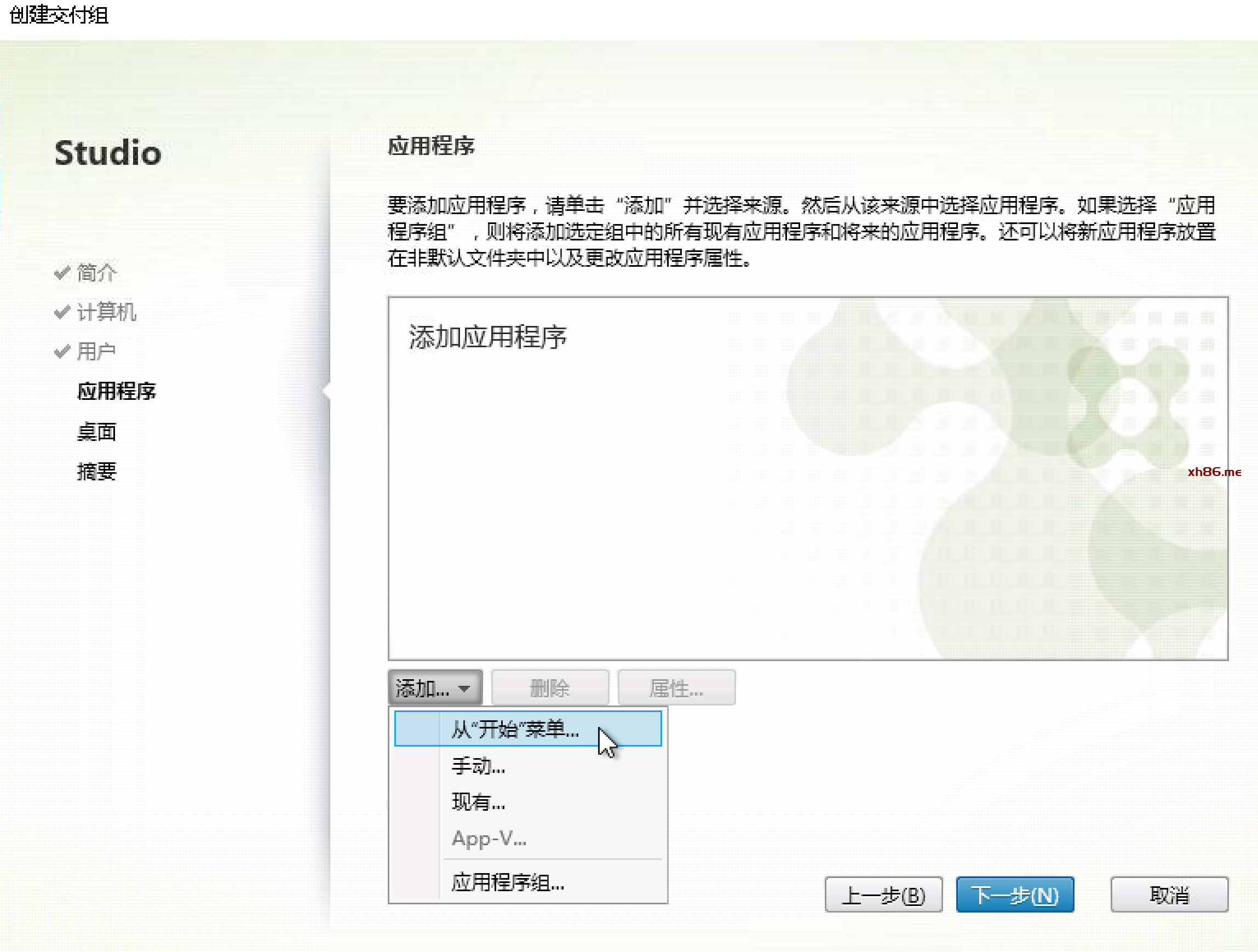 | 选择“从”开始”菜单”添加要发布的虚拟应用