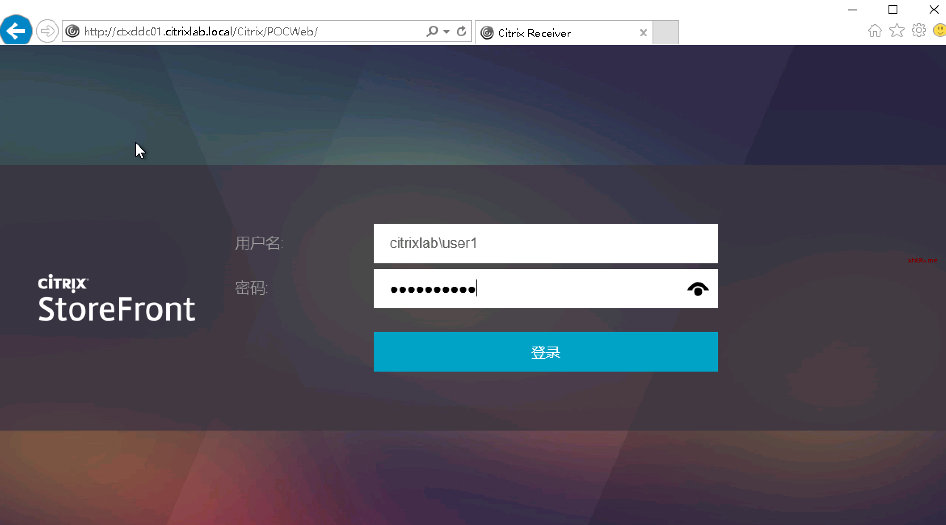 打开浏览器,输入StoreFront地址:http://ctxddc01.citrixlab.local/Citrix/POCWeb,输入用户名密码,点击登录