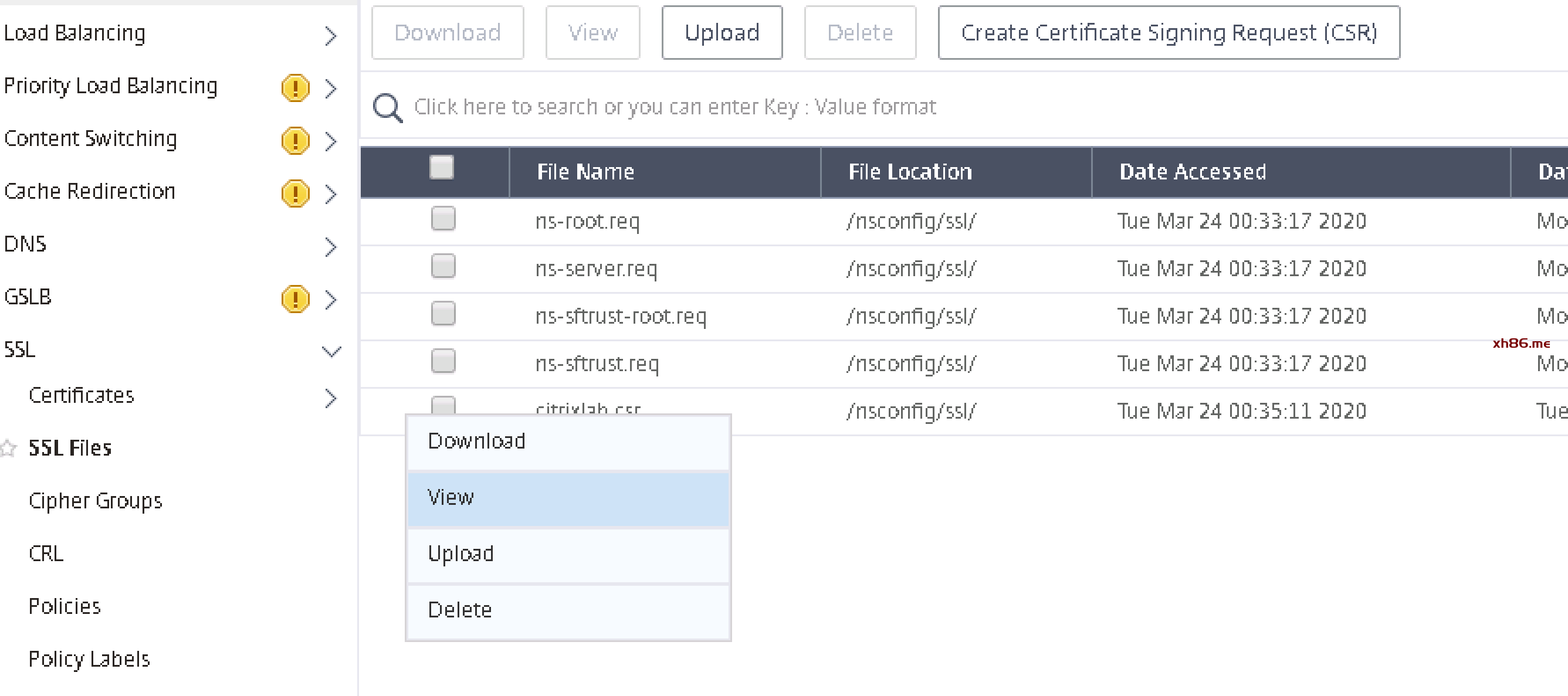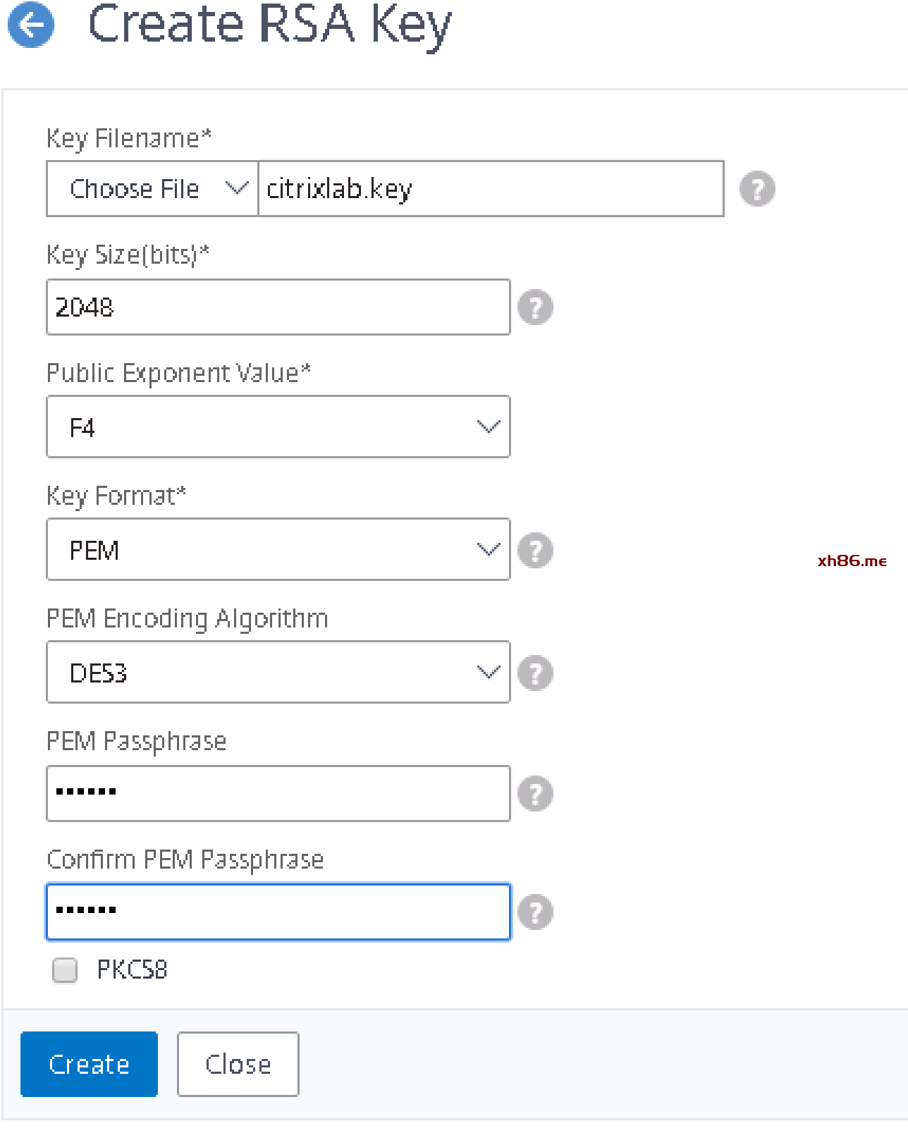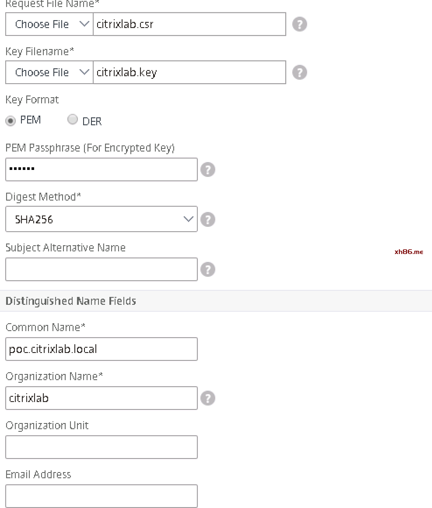 输入CSR文件的名称,浏览到刚刚建立的RSA key,输入Key的密码,加密可为SHA256,输入Common name,这里是poc.citrixlab.local,输入Organization name,这里为citrixlab,输入state,country等必填项,点击create。