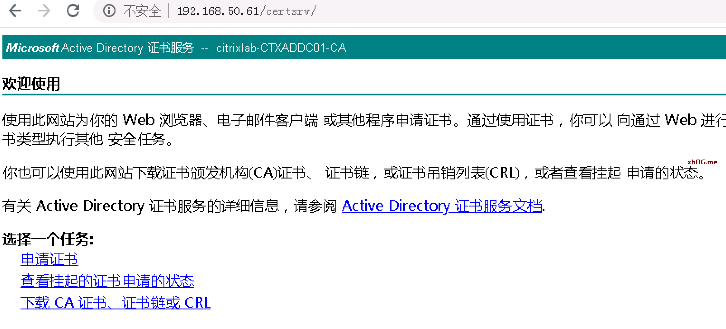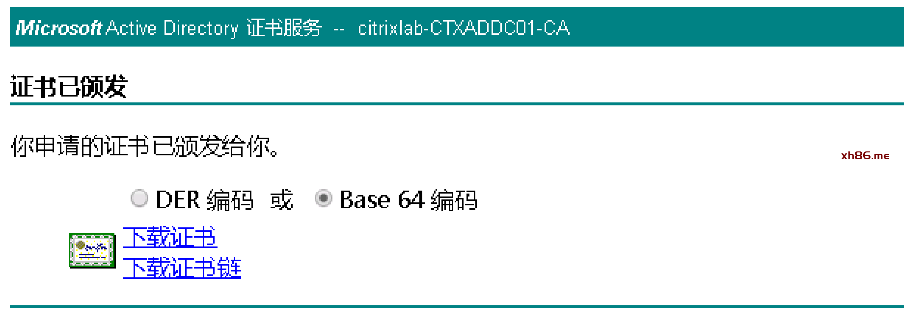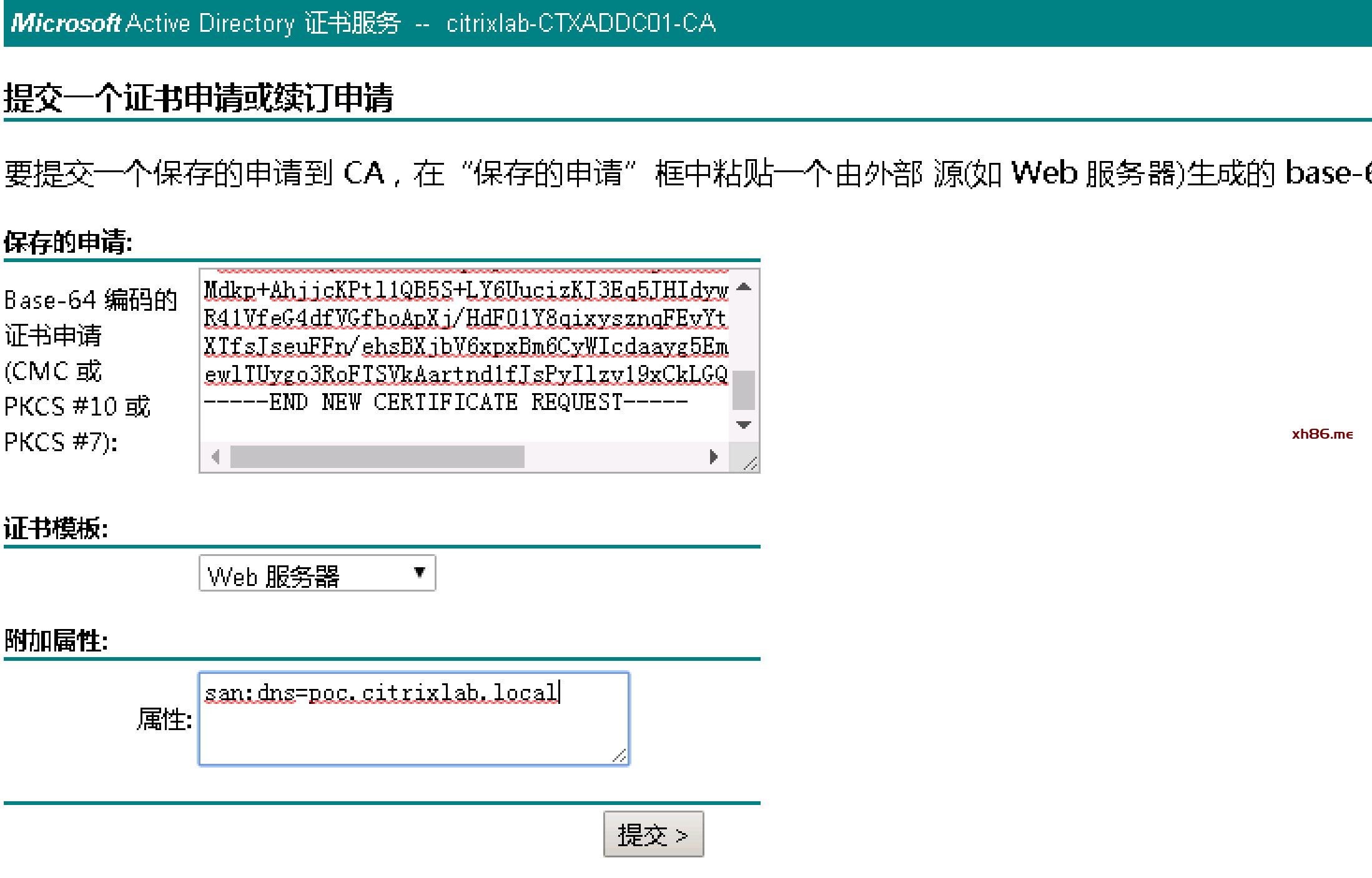 粘贴CSR内容,选择Web服务器为证书模板,附加属性可以设置为san:dns=poc.citrixlab.local,点击提交。