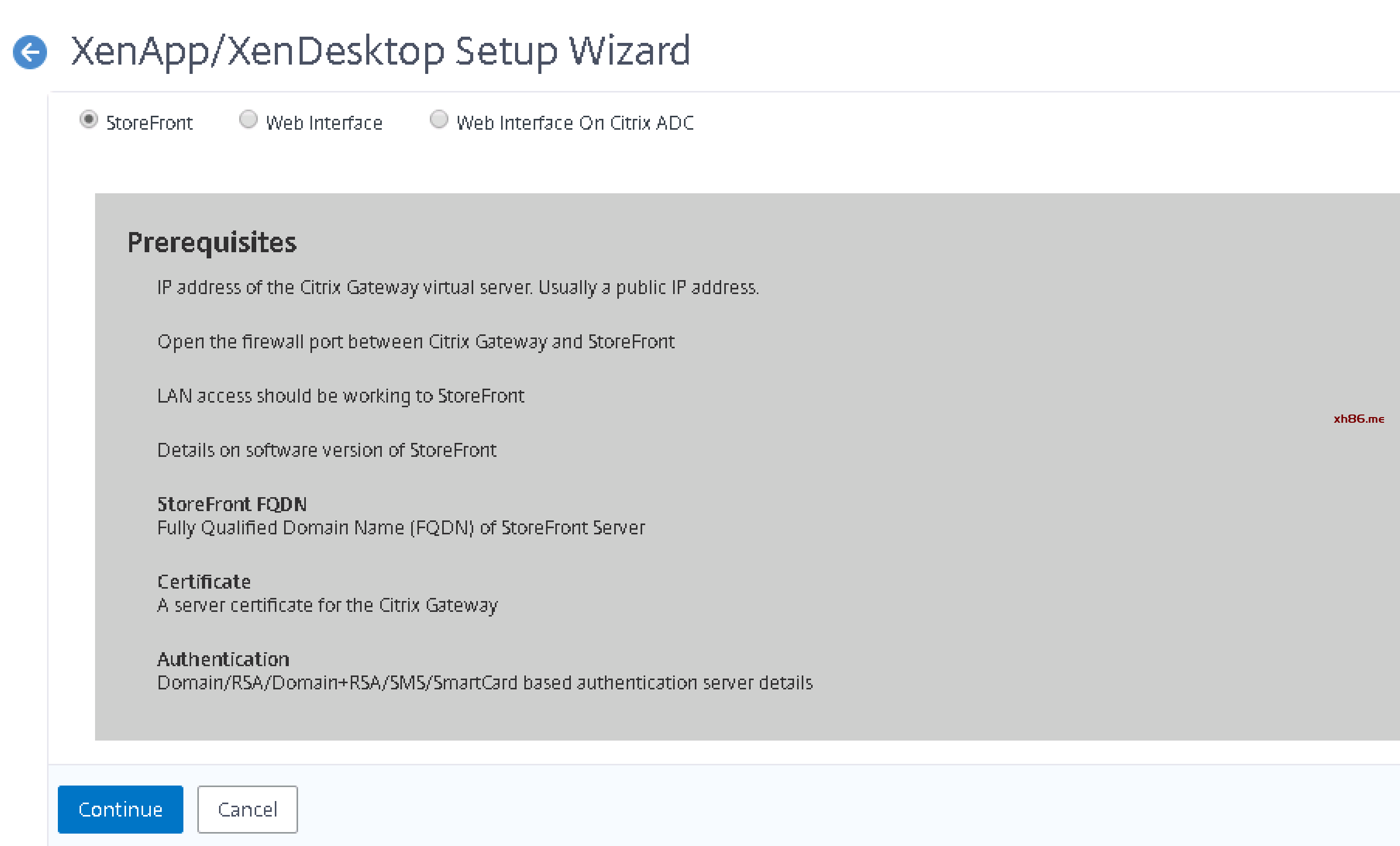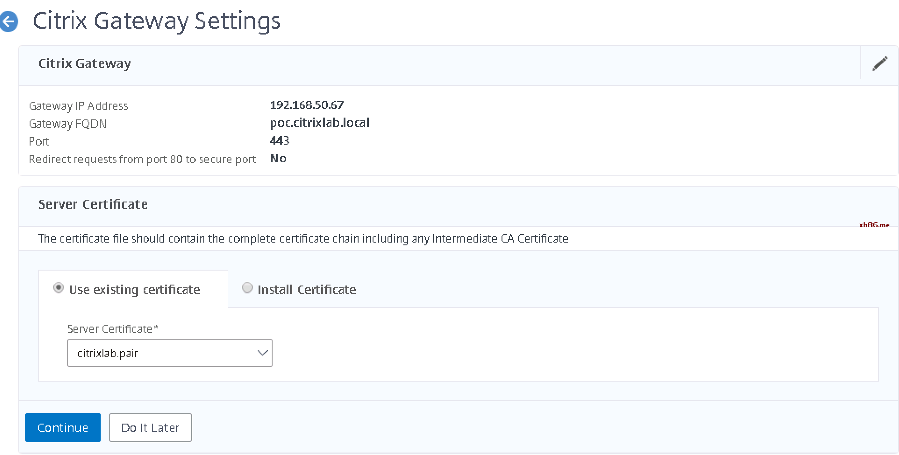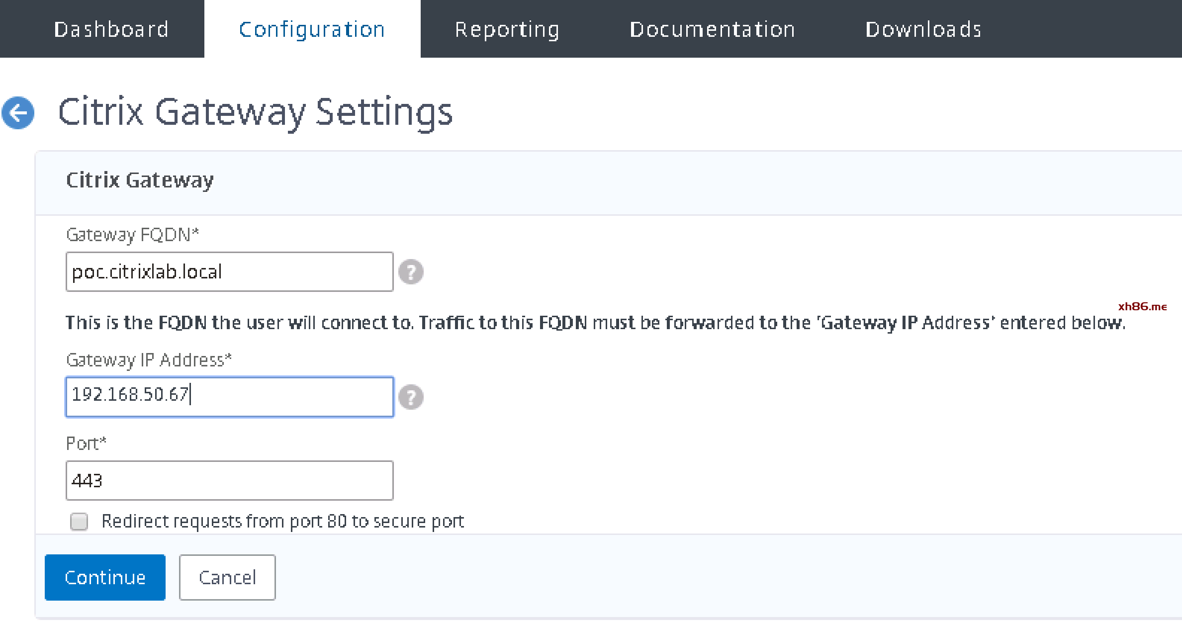 输入Gateway FQDN,这里为poc.citrixlab.local,输入Gateway IP地址,即virtual IP地址,点击continue。