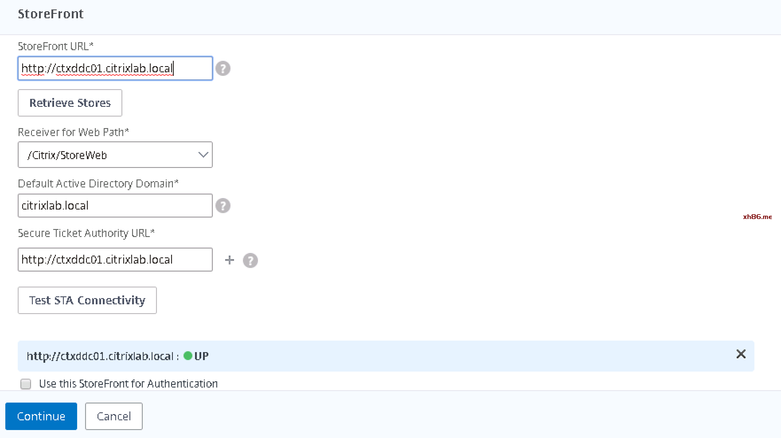 输入storefront URL,这里为https://ctxddc01.citrixlab.local,点击retrieve stores,会自动检测到Receiver for web path,这里为/citrix/storeweb,输入AD domain,输入secure ticket authority URL,这里为http://ctxddc01.citrixlab.local ,点击continue。