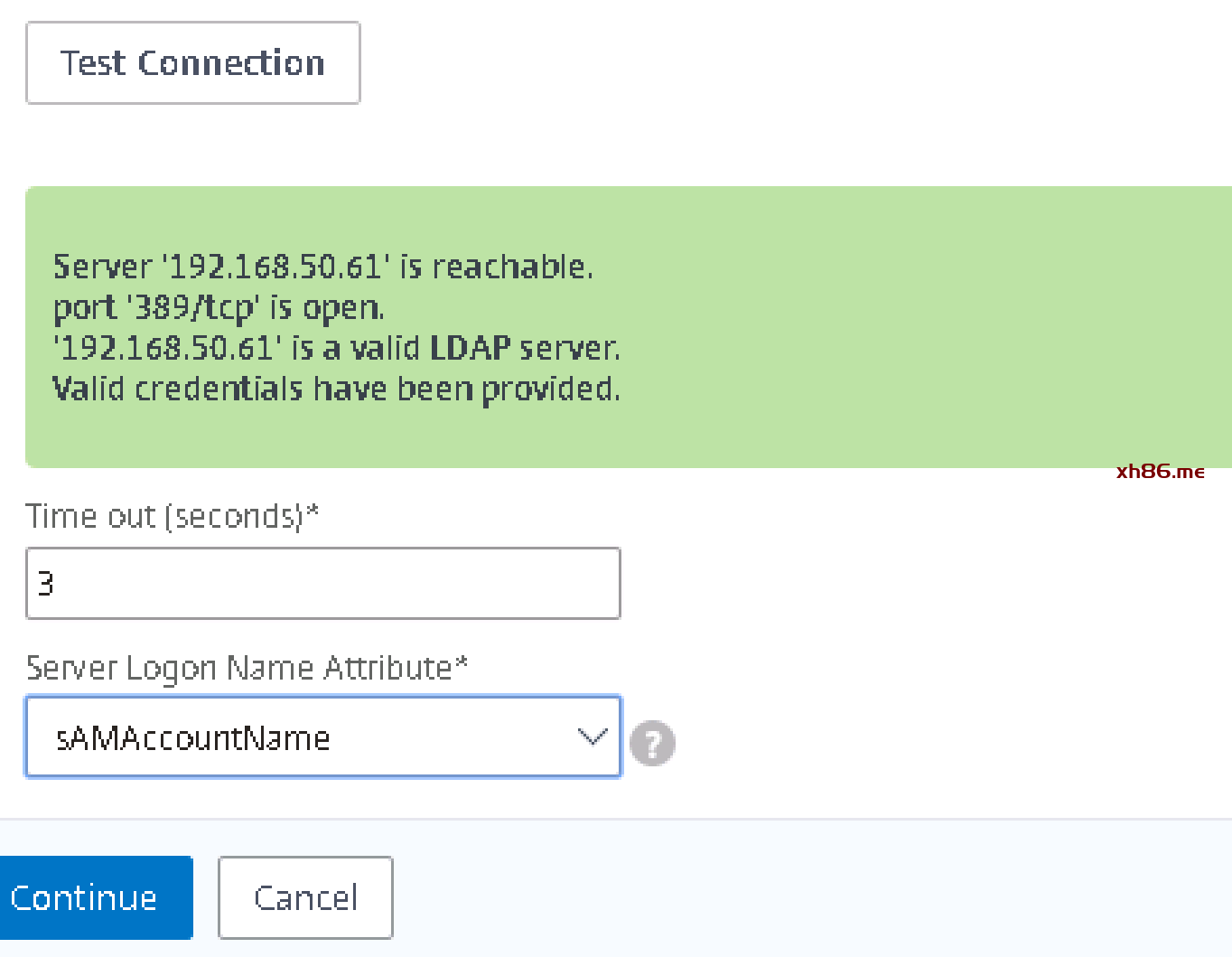 点击test connection,测试可否连通domain,server logon name attribute选择为sAMAccountName,点击continue。