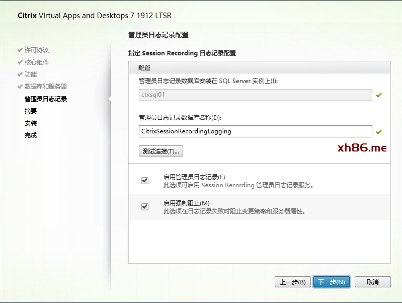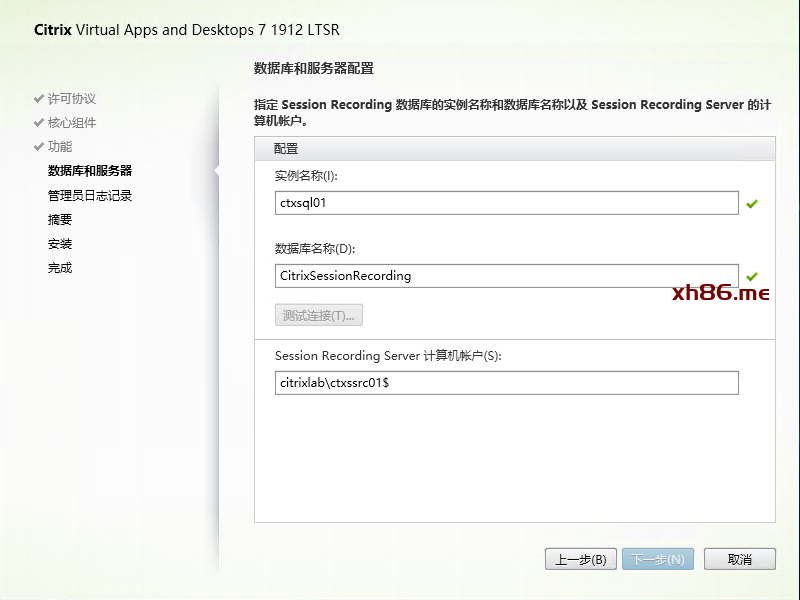 指定数据库实例名称及数据库名称,同时提交本机的计算机账户,请注意计算机账号以$结尾。点击测试连接确保连接正常。在验证过程中, Session Recording Server 计算机账户区域内输入 “citrixlab\ctxssrc01$” 会报1063错误, 然后输入“ localhost ” 可以通过创建数据库. ![]() |