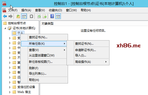 在“个人”->“所有任务”->“申请新证书”,