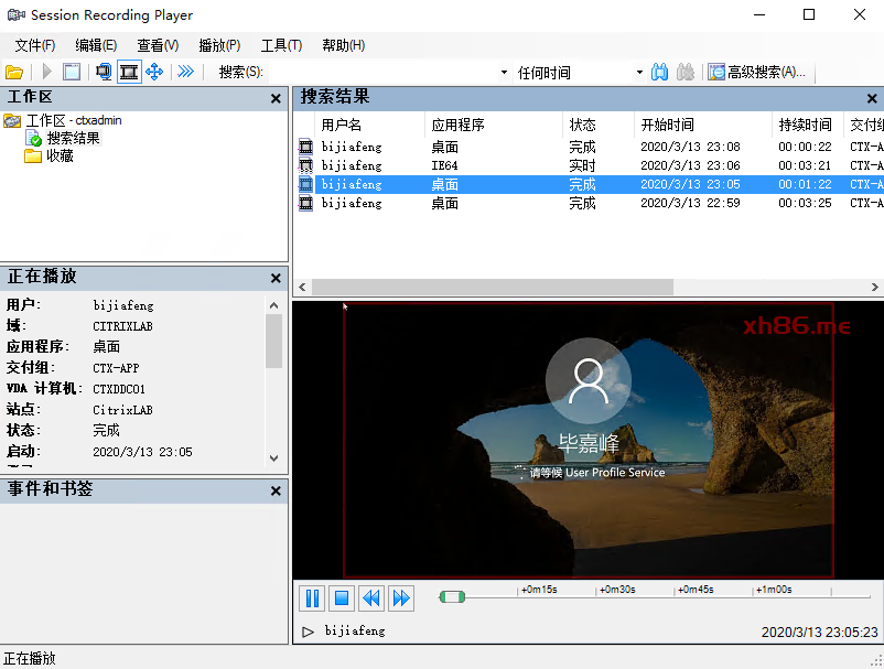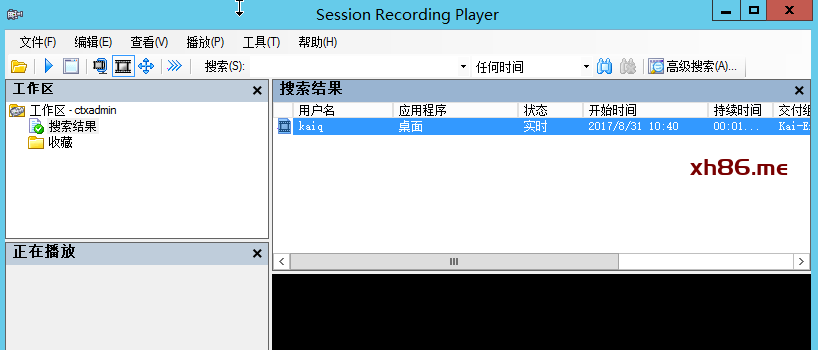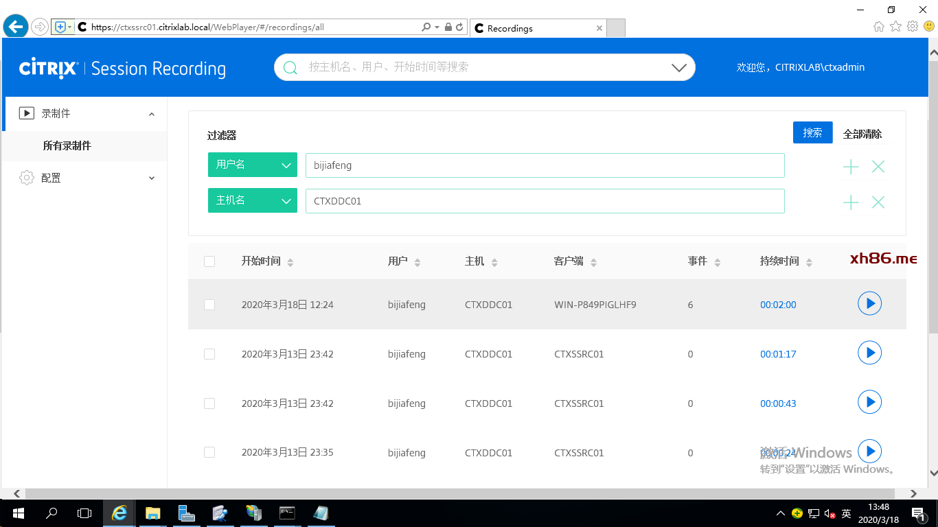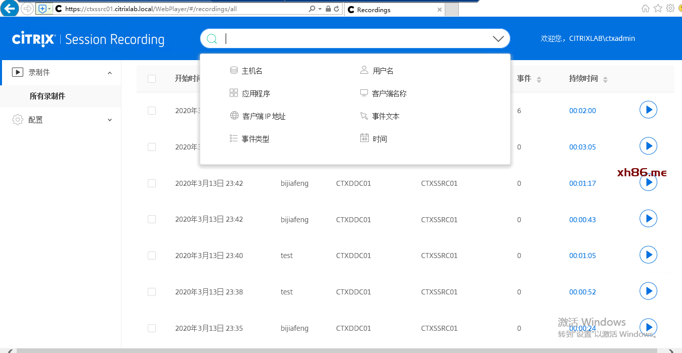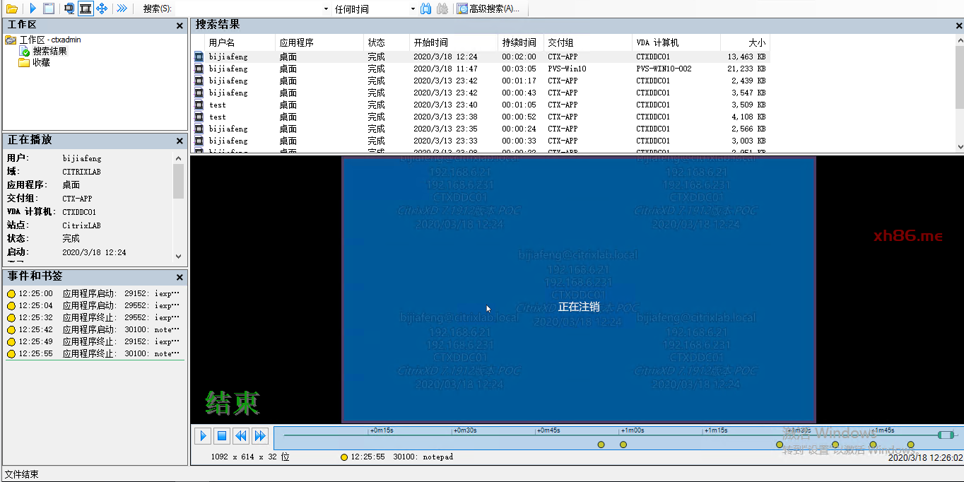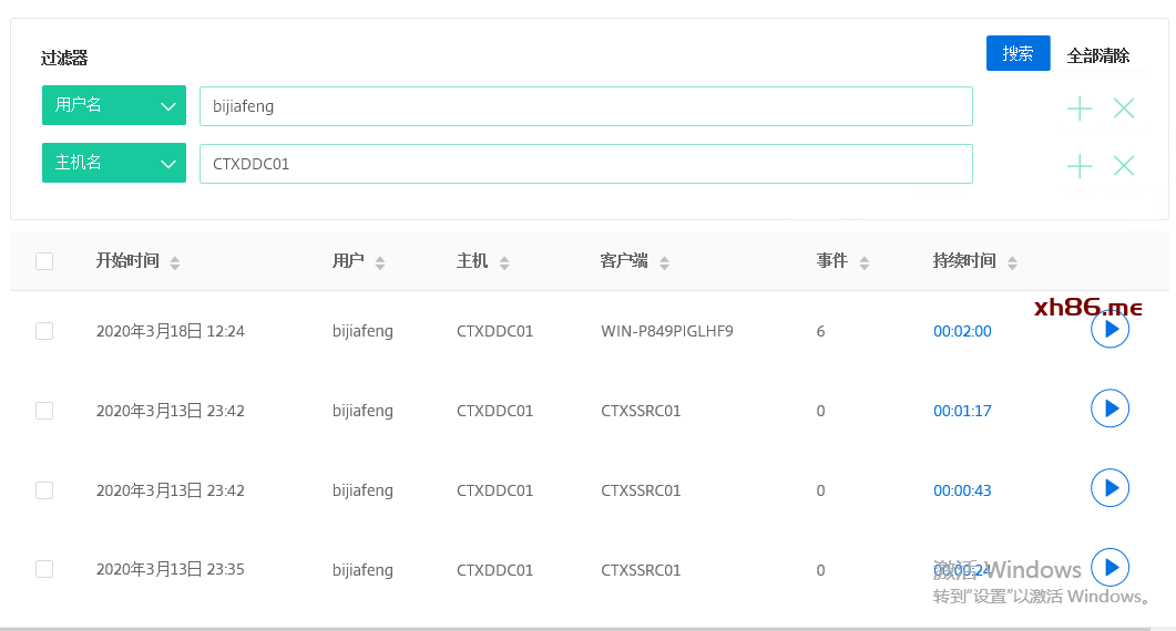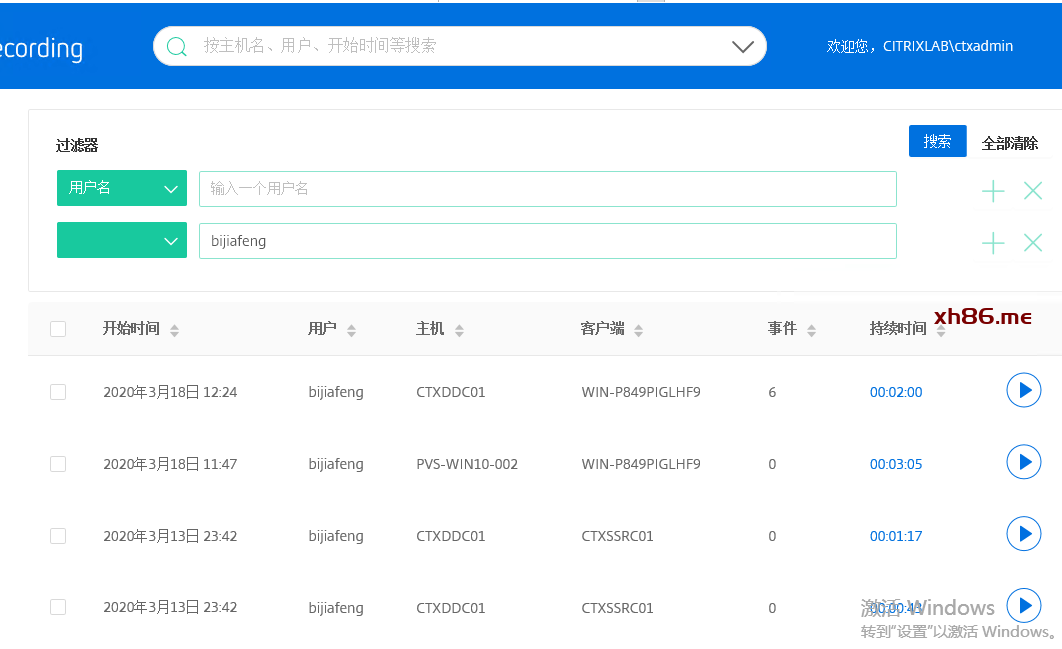 我们也可以通过过滤器来筛选更详细的录制件,例如过滤条件设置为用户名bijiafeng、主机名CTXDDC01,这时候搜索结果就是这个用户登录CTXDDC01的录制件(注意,因资源有限,我用CTXDDC01发布的共享桌面和VirtualAPP)。