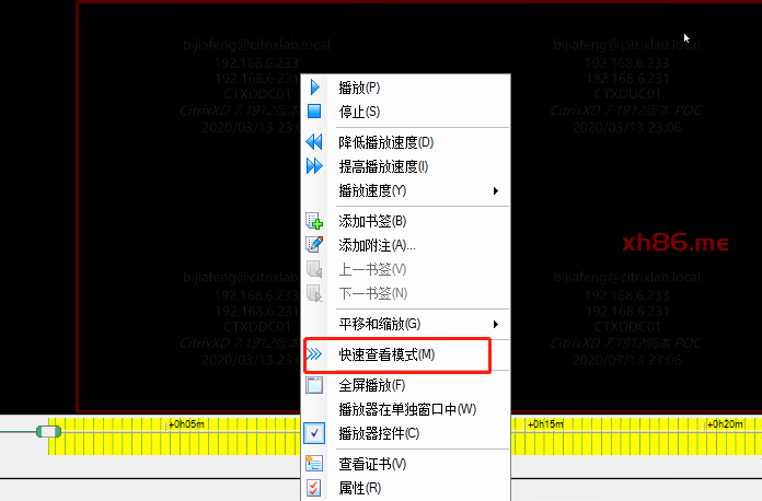 当我们会看录制件时,如果用户长时间没有操作键鼠,我们也不知道何时会有操作,这个问题是很头疼的,好在Citrix Session Recording Player提供了这个功能,会话空闲高亮提示。比如下边这个半小时的录制件,大部分时间是处于空闲状态,黄色标记的就是鼠标或键盘没有操作的那段时间,这样我们就可以很轻松跳过这些时间,直接播放用户有操作的时间点即可。